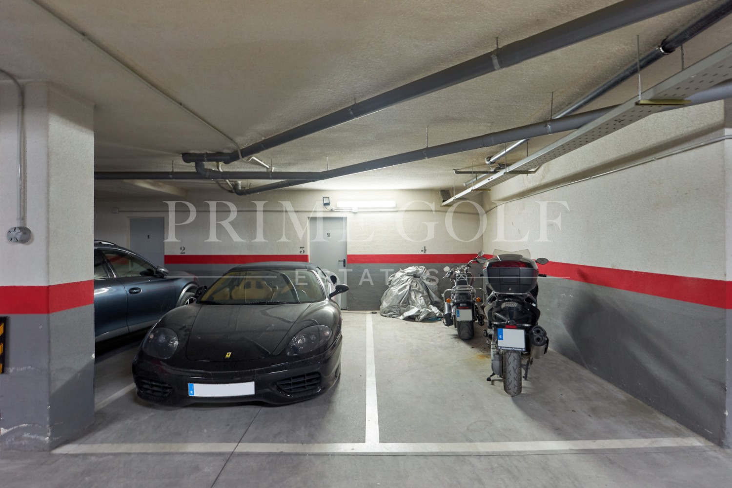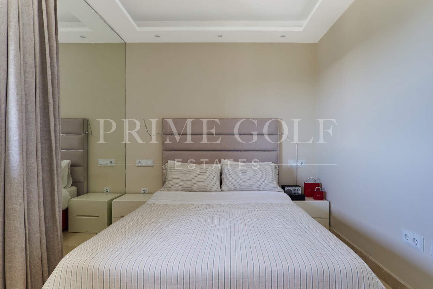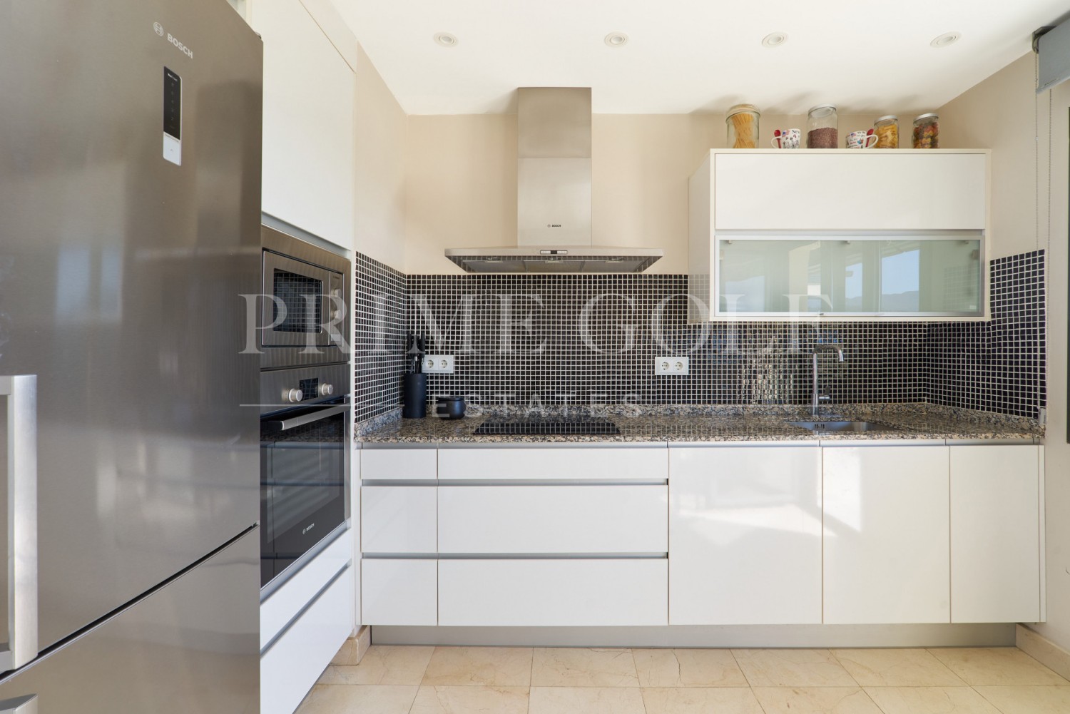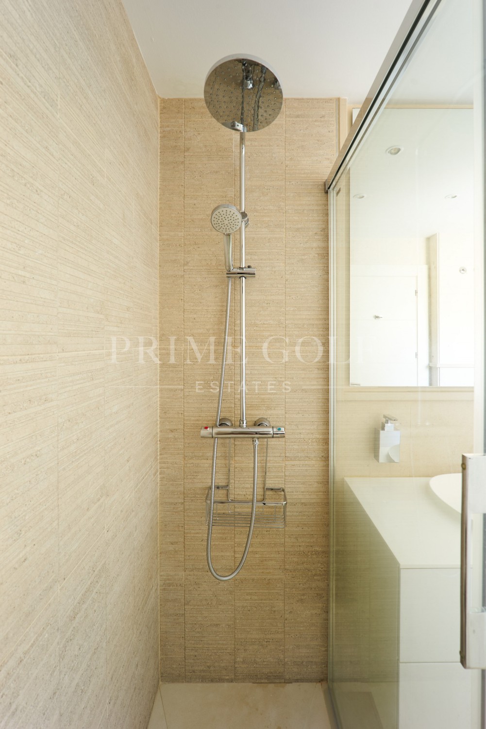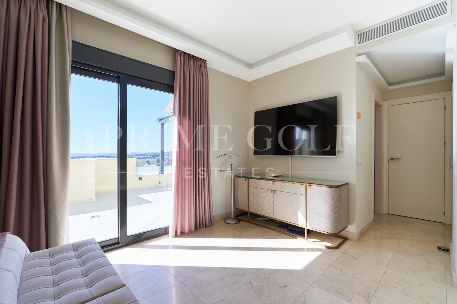 The penthouse has two spacious bedrooms and two bathrooms, providing privacy and comfort. The third bedroom has been converted into a dressing room. The fully fitted open plan kitchen has modern appliances that seamlessly connect with the living areas. The property is in excellent condition, reflecting the meticulous maintenance and attention to detail.