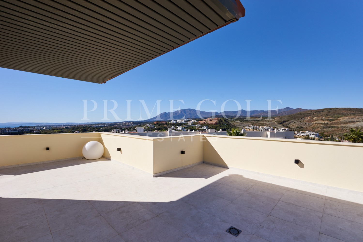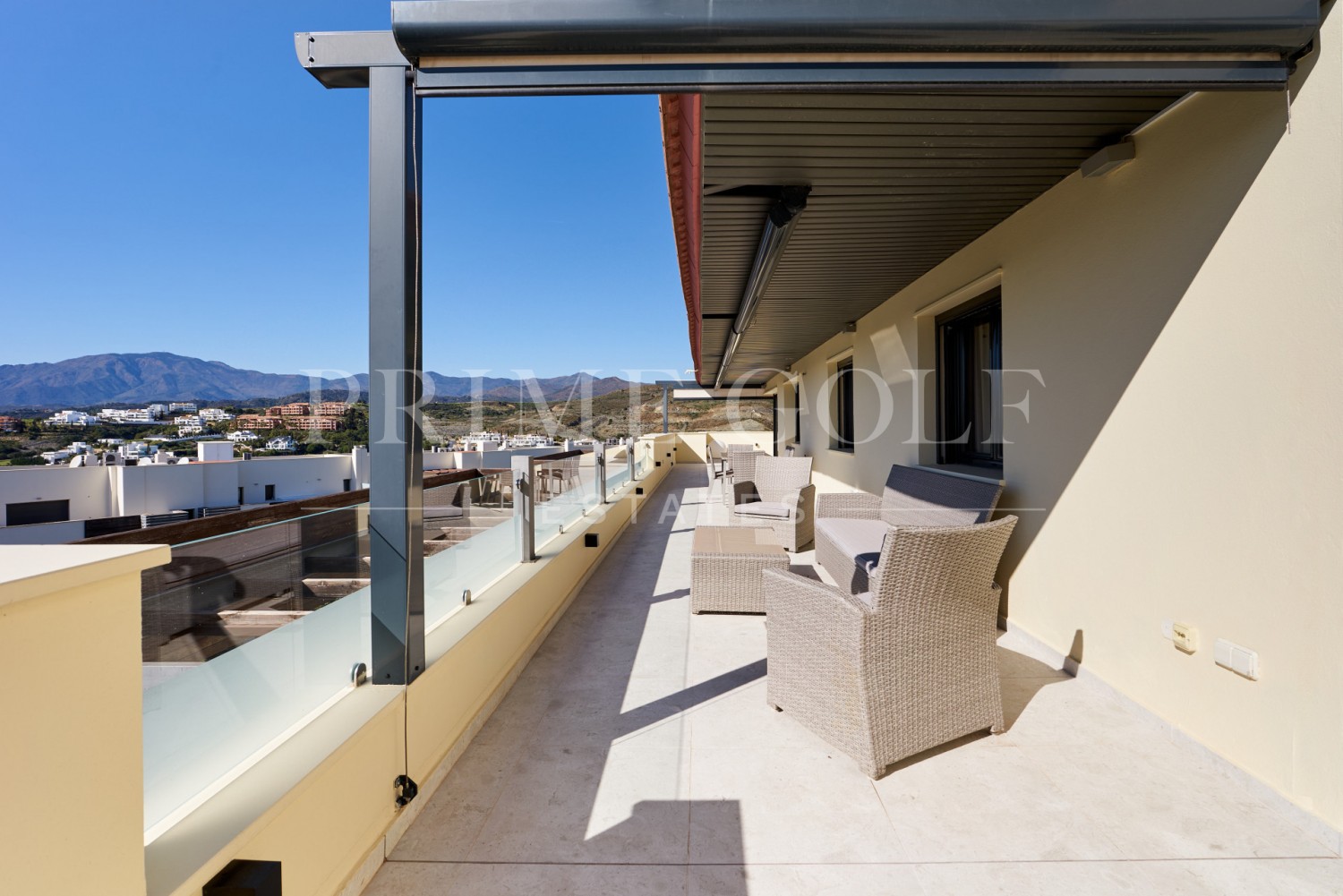 The highlight of this penthouse is the outdoor living with its private terrace offering panoramic views of the sea, mountains, golf courses. Residents can also enjoy three communal swimming pools and a beautiful garden, as well as access to a tennis/paddle court, mini golf. The property is part of a gated community with a secure entrance, video intercom and lift, providing peace of mind and convenience. Additional features include electric blinds, double glazing, storage and fibre internet.