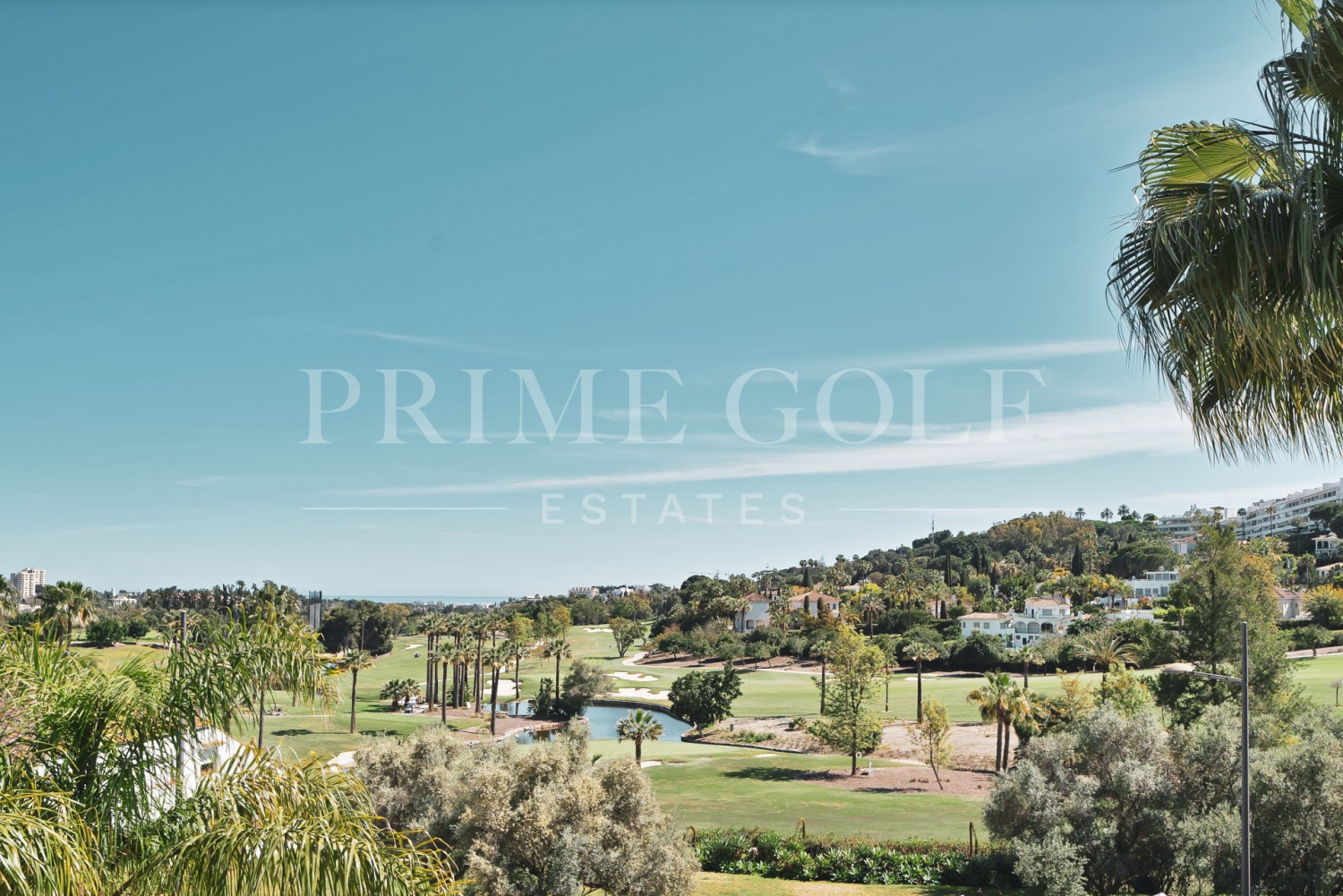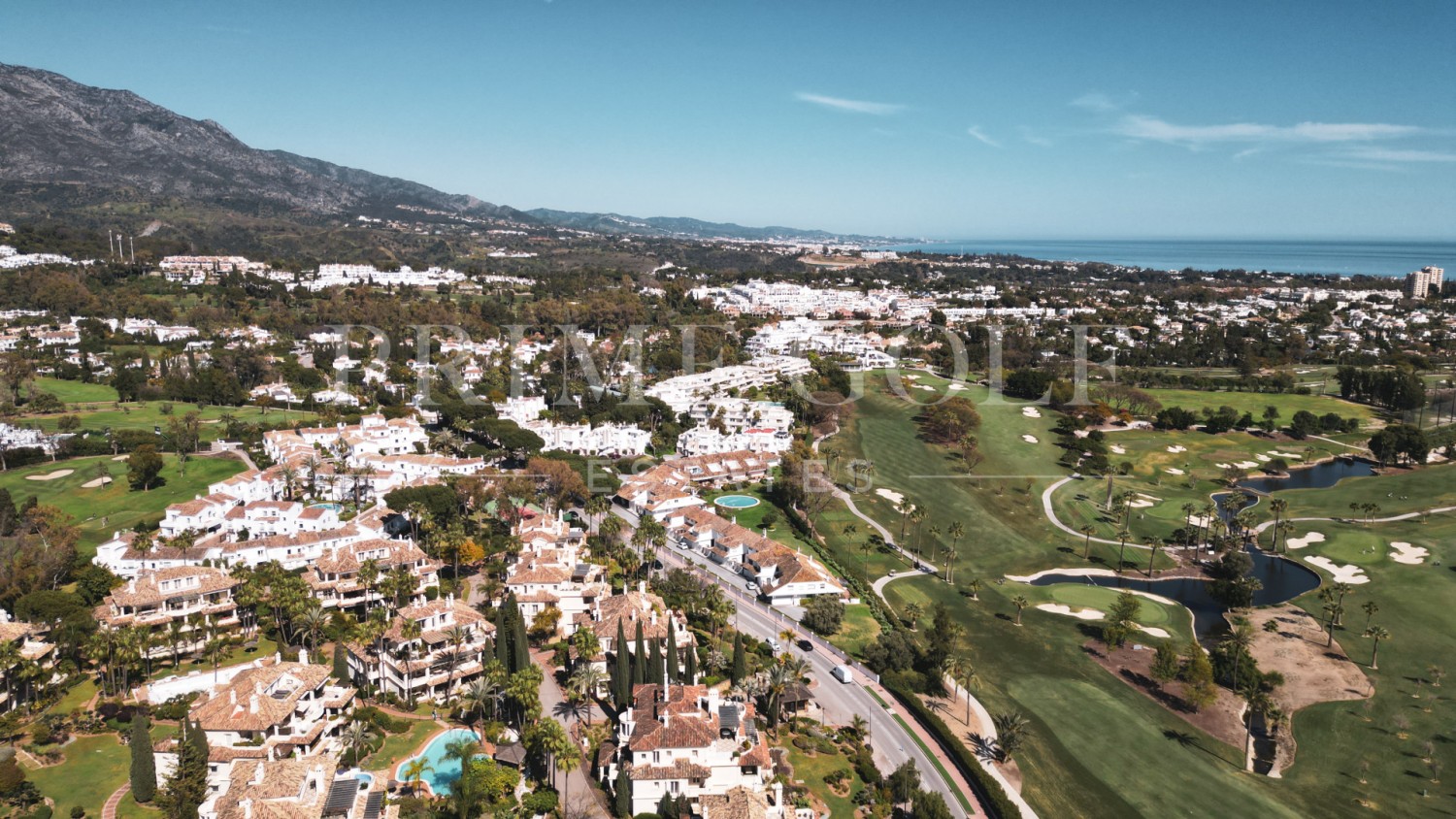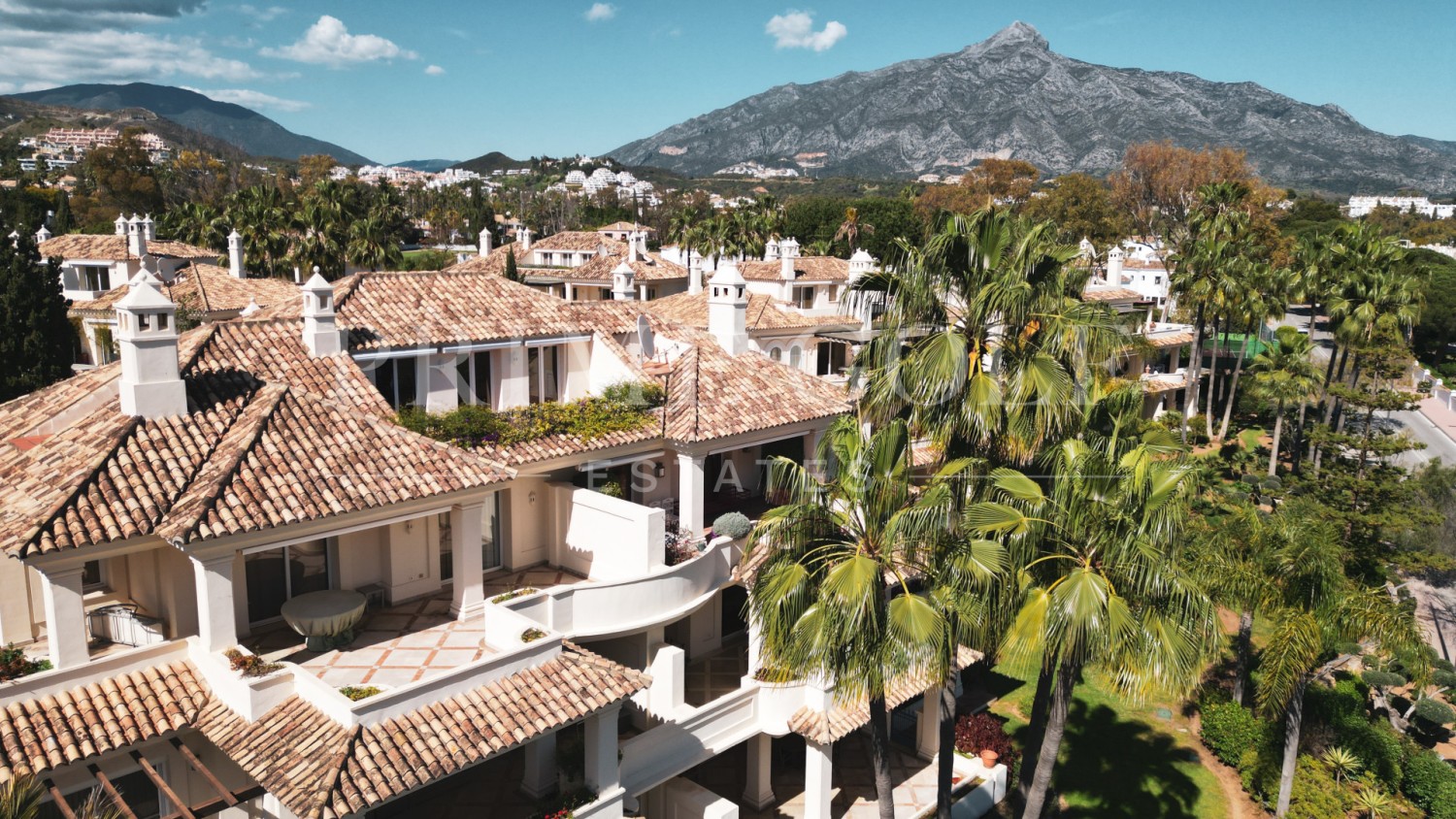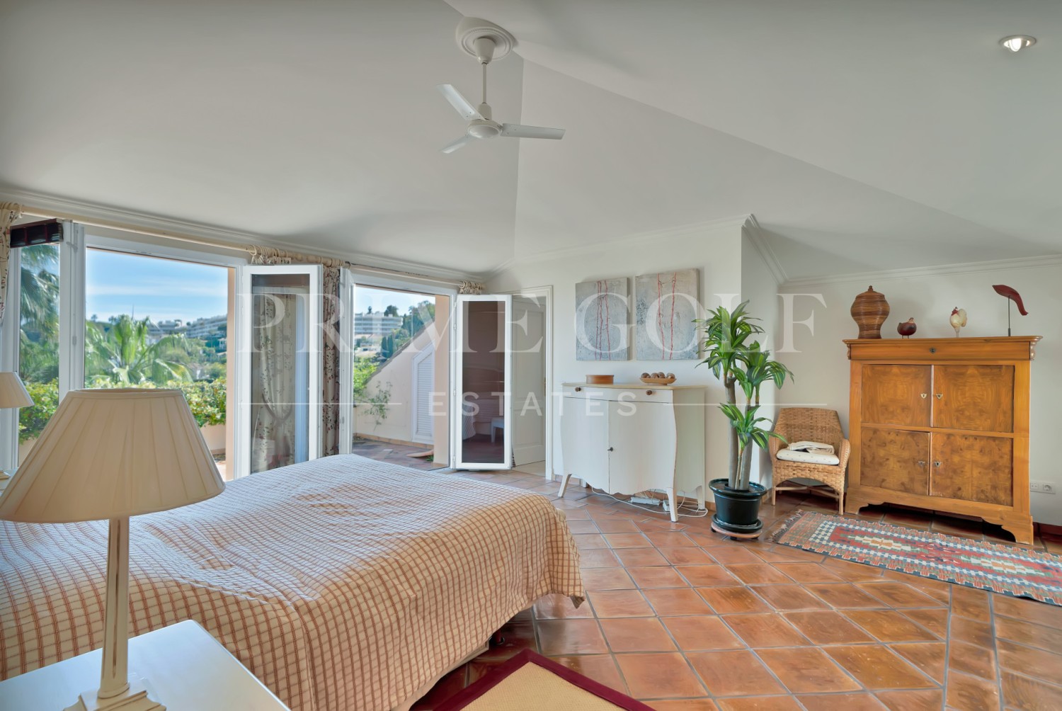 The spacious living and dining area leads to a front terrace with stunning panoramic views of the golf course and the sea, while the rear terrace provides serene vistas of La Concha Mountain, the landscaped gardens, and the pool.