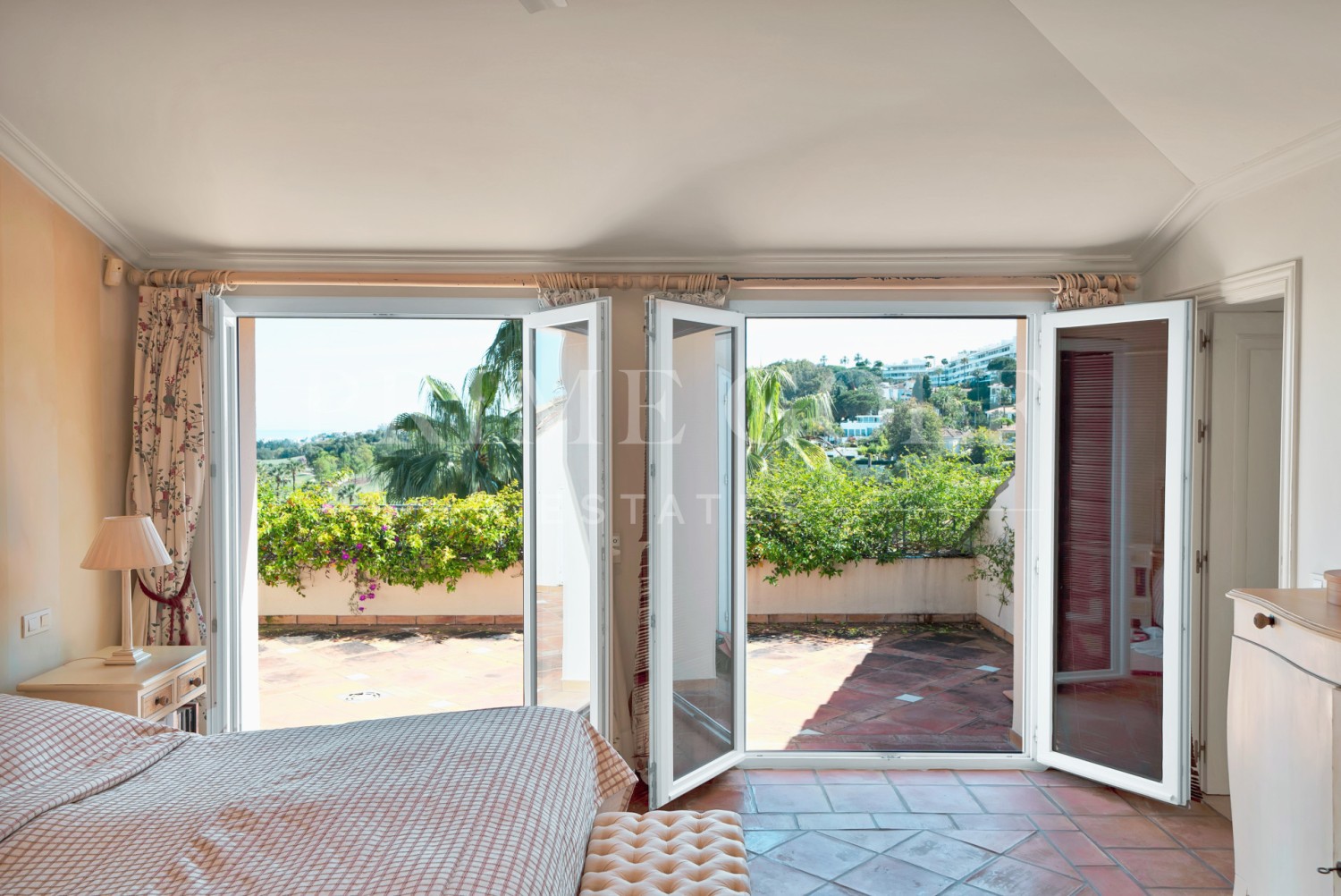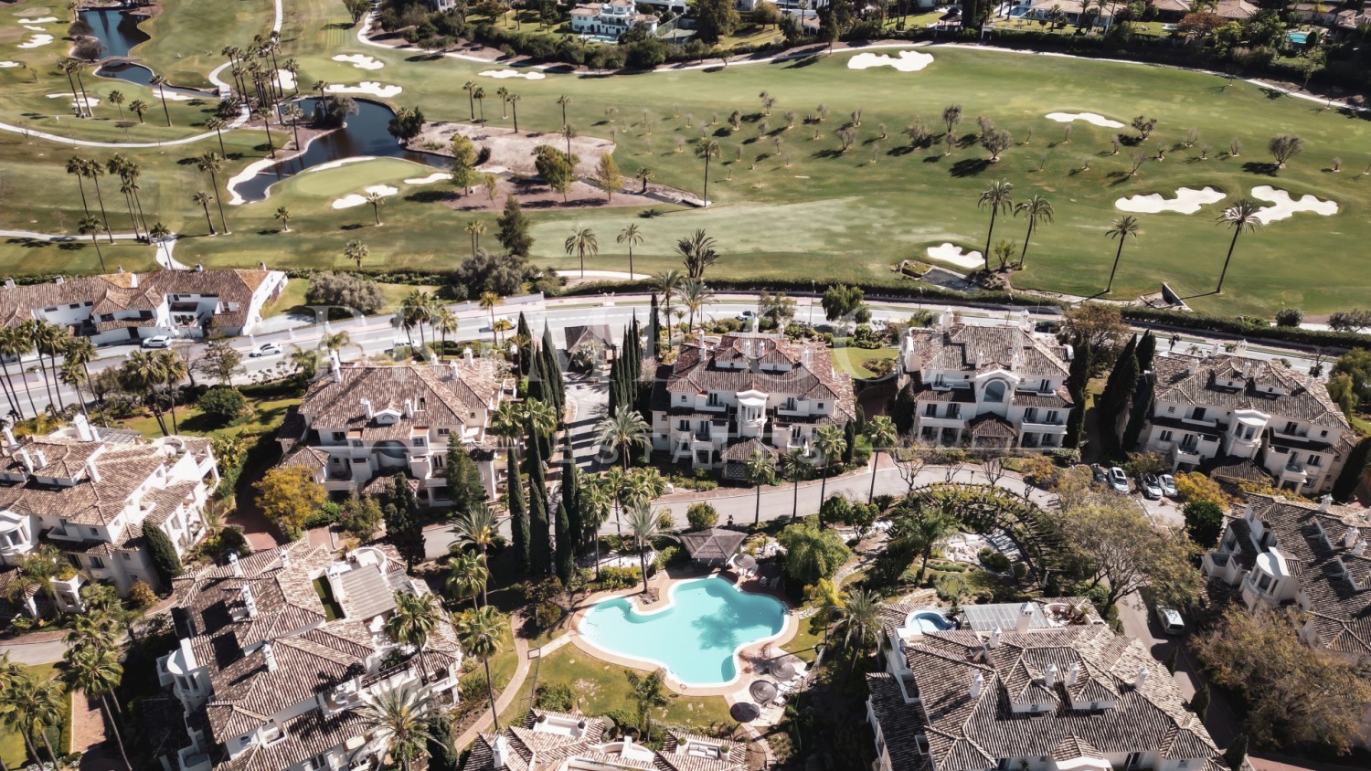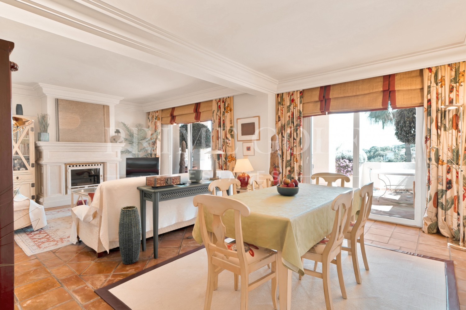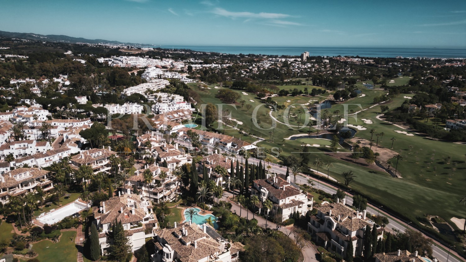 The spacious living and dining area leads to a front terrace with stunning panoramic views of the golf course and the sea, while the rear terrace provides serene vistas of La Concha Mountain, the landscaped gardens, and the pool.