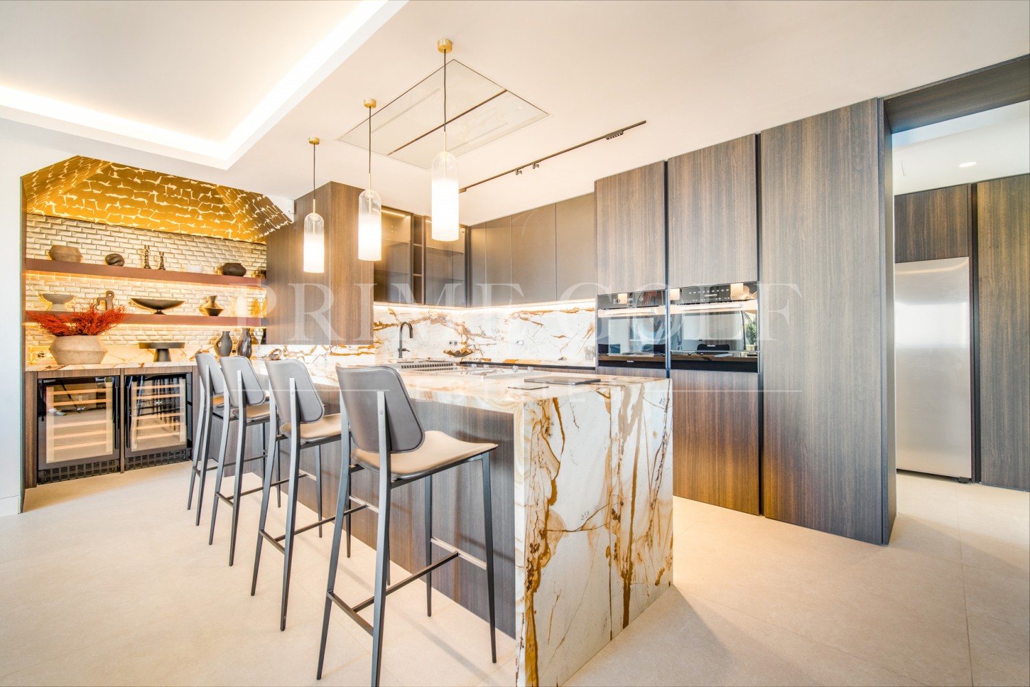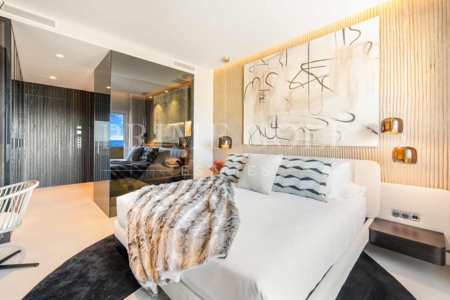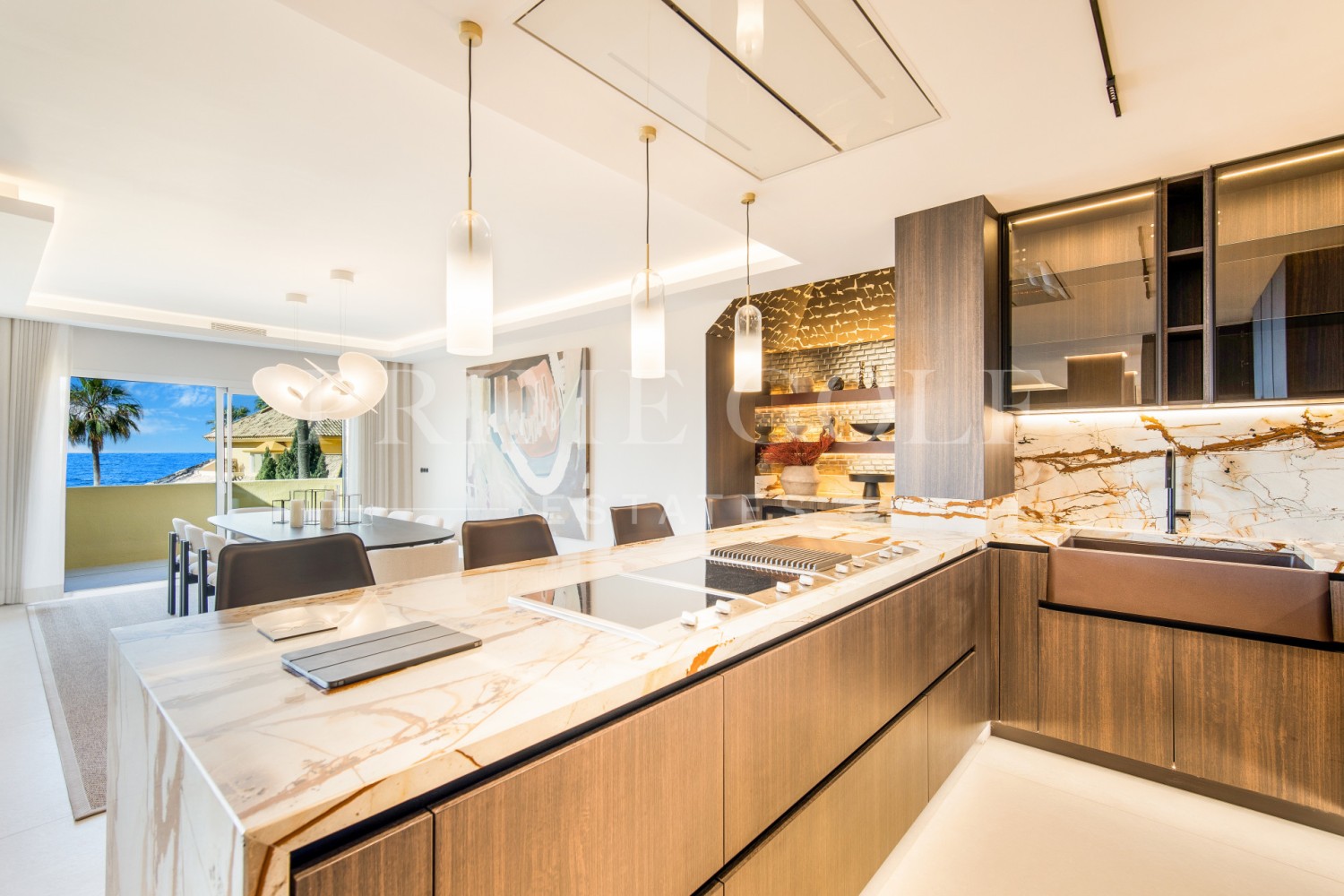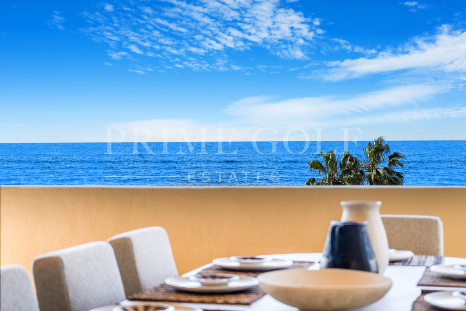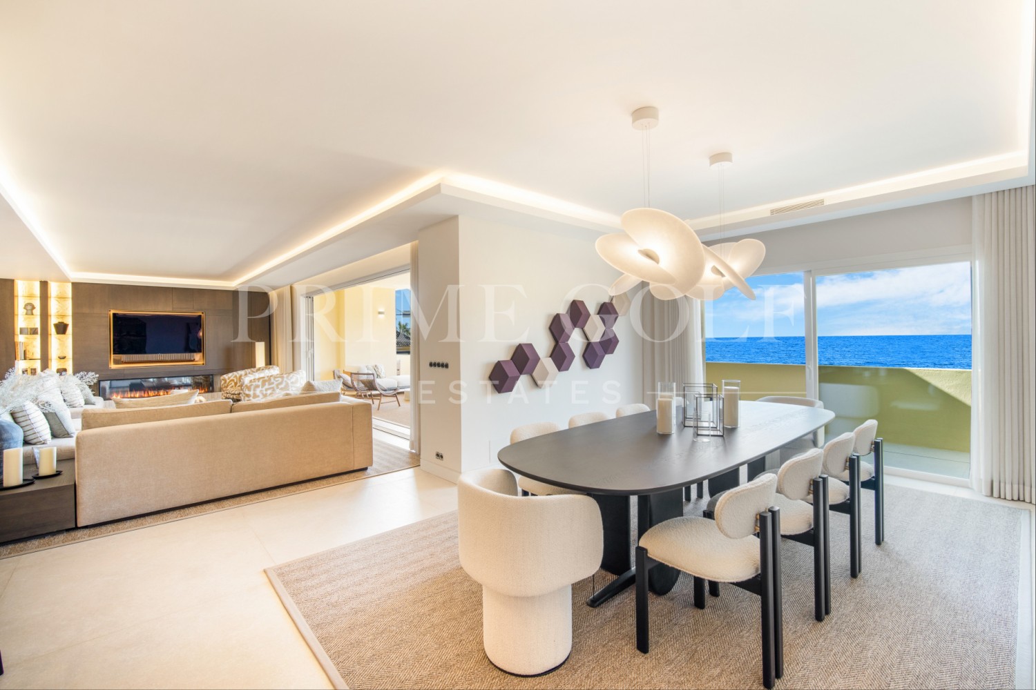 Exceptional four bedroom, south facing duplex penthouse in Rio Real Playa; a unique and luxurious frontline beach property with panoramic sea views and close to Marbella Centre. This beachside gated community offers 24hr security, communal pools and lush gardens. The property has been renovated to the highest standard with high end appliances and exquisite furniture. On the entrance there is an open plan living and dinging area with outstanding sea views; an open plan kitchen; separate laundry area; three guest suites; and access to a spacious terrace with incredible views. There is an internal staircase that leads to the second level, giving access to the impressive master suite, complete with walk in closet, two bathrooms, sauna and private terrace. Other features include private parking, storeroom, hot and cold air conditioning and underfloor heating throughout.