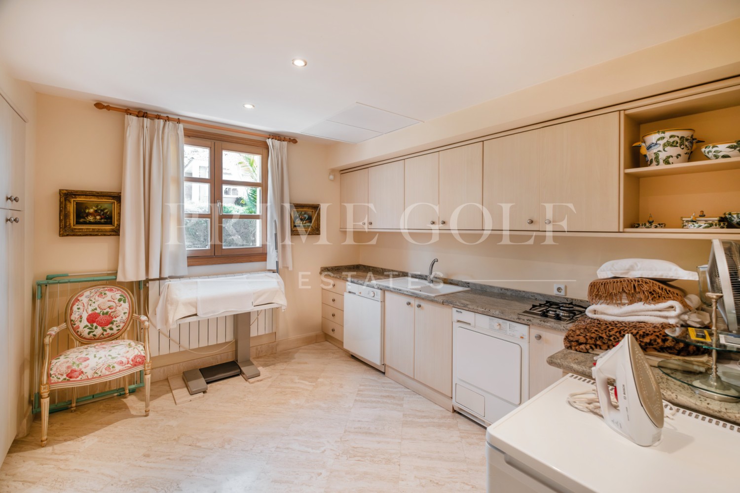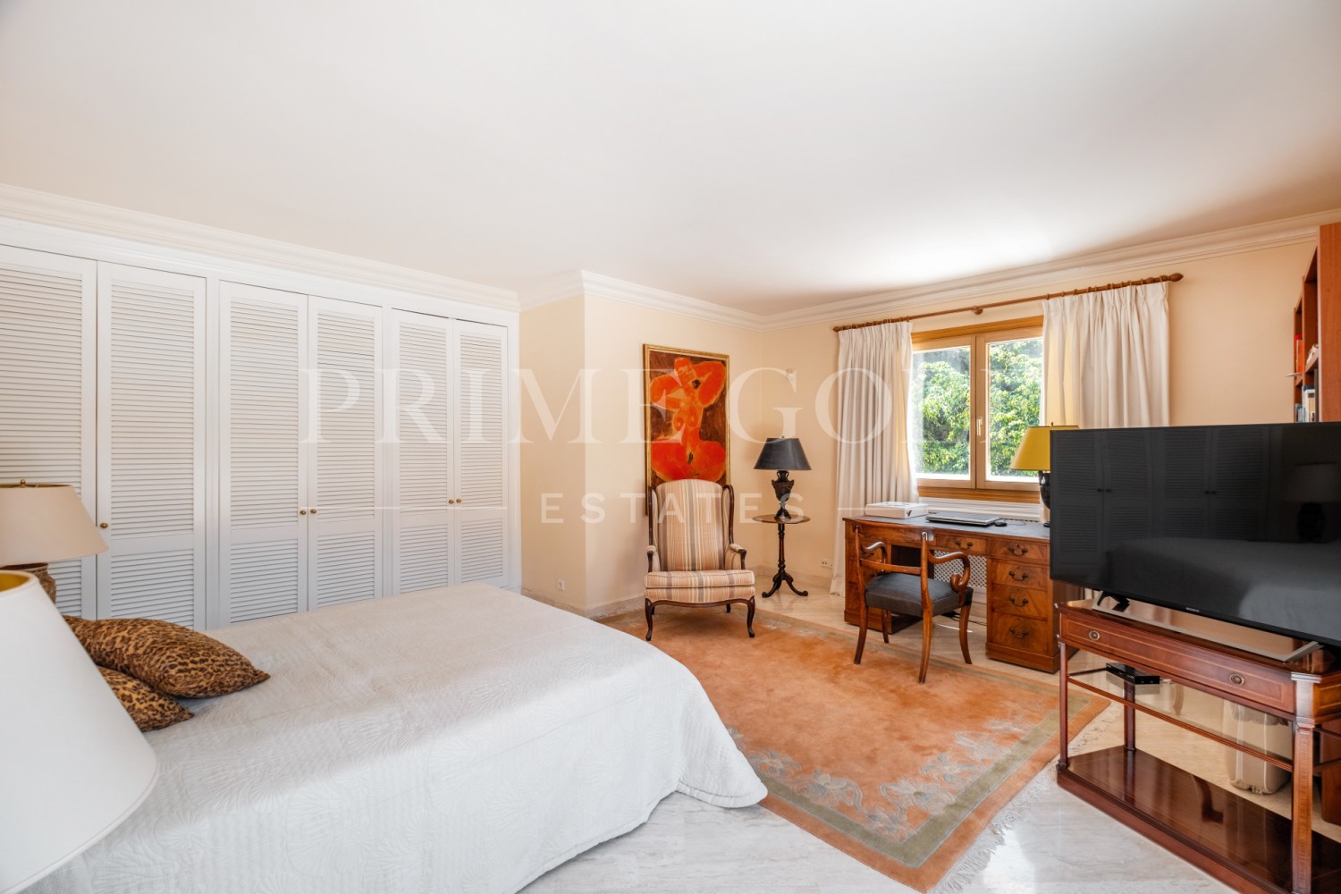 The property was originally built in 1986 and underwent renovations in 2002. The layout includes a spacious living area with seamless access to outdoor terraces, a well-appointed kitchen, and an office. The private garden and pool offer the perfect setting for outdoor relaxation, while a private garage with two parking spaces ensures convenience.