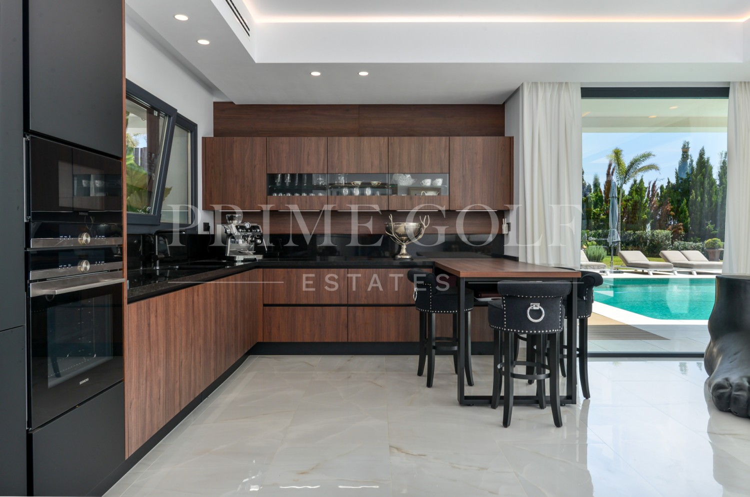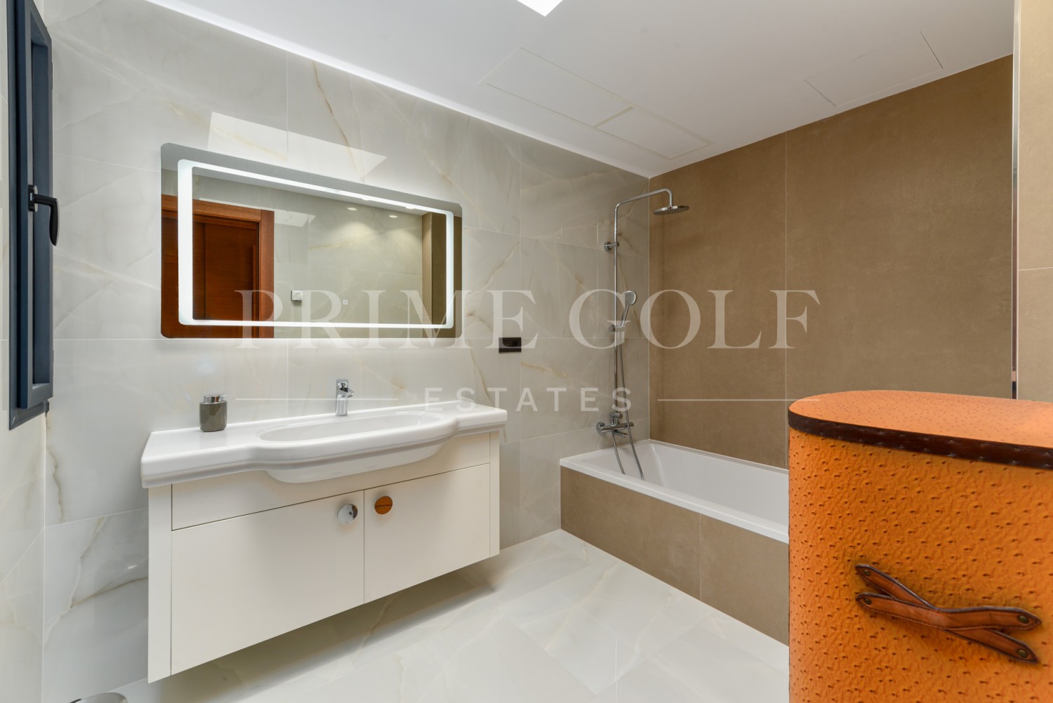The villa is built over 560m², complemented by a 150m² terrace and a generous 1,356m² plot, providing ample space for relaxation and entertainment. The property features a private swimming pool and garden, a modern fully fitted kitchen, and a separate dining room ideal for gatherings. Additional highlights include a cinema room, gym, sauna, steam room, and a dedicated SPA area, making it well-suited for both leisure and well-being. The villa also benefits from a guest room, office room, storage room, laundry room, and a kitchenette, ensuring convenience for everyday living.