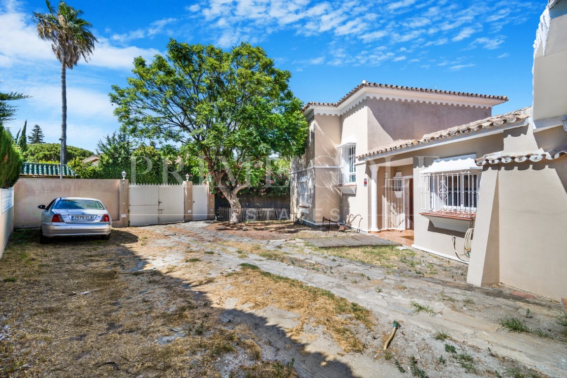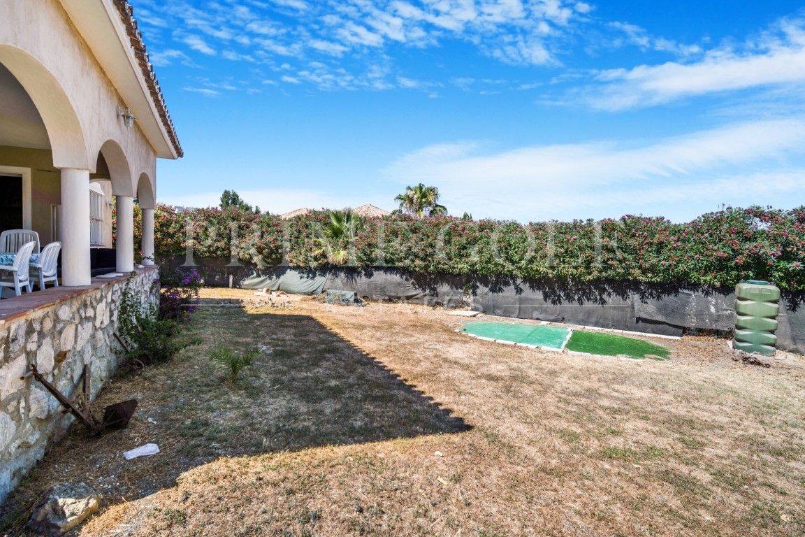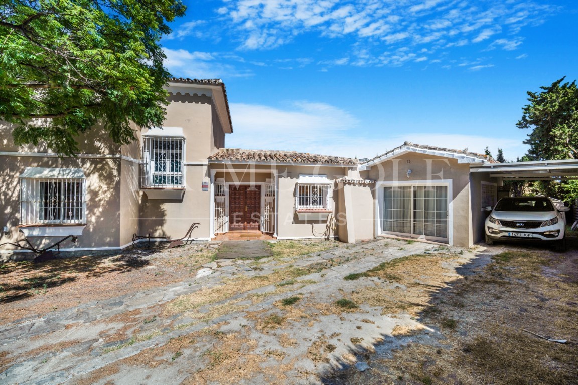 Excellent four bedroom south facing villa in a residential area of Guadalmina Alta; just a short drive to local amenities, the beach, Marbella and Puerto Banus. The property is distributed over two levels; the entrance has a spacious hall; open plan living and dining room with sliding doors leading to the private terrace and garden; bedroom which is currently being used as an office; fully fitted kitchen; two guest bedrooms; guest bathroom; and a guest toilet. There is also access from the kitchen to the converted garage which is now a large multi-purpose room which could be used as an additional bedroom or gym. The upper-level leads to the master suite with walk in closet and private terrace with partial sea views. Other features include a spacious driveway and private car port and hot and cold air conditioning.