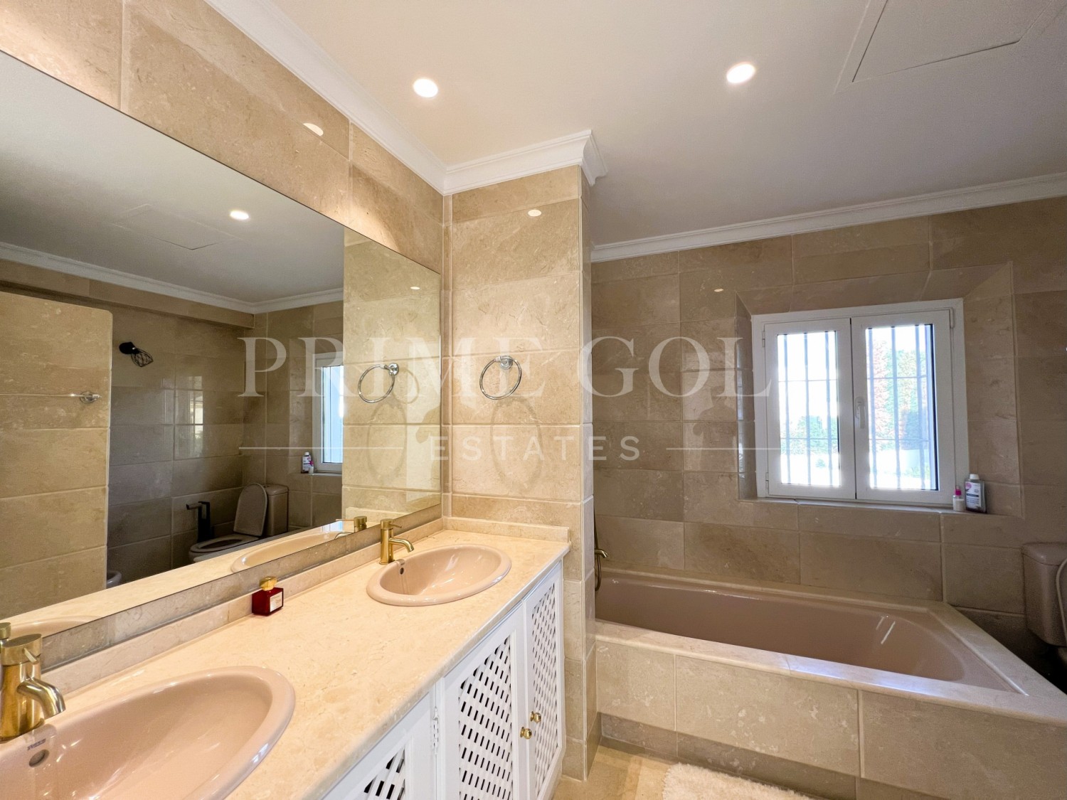 Security and convenience are prioritised with a 24-hour security service, alarm system, and a carport garage. The villa is ideally located close to golf courses, schools, and local amenities, and benefits from fibre optic internet connectivity. Fitted wardrobes, a private balcony, and panoramic views further enhance the appeal of this sole agency luxury property in Sotogrande.