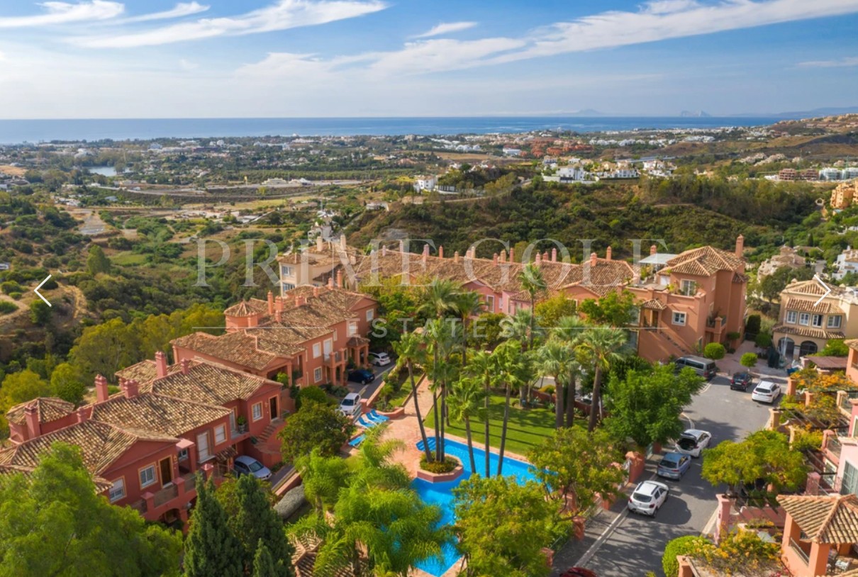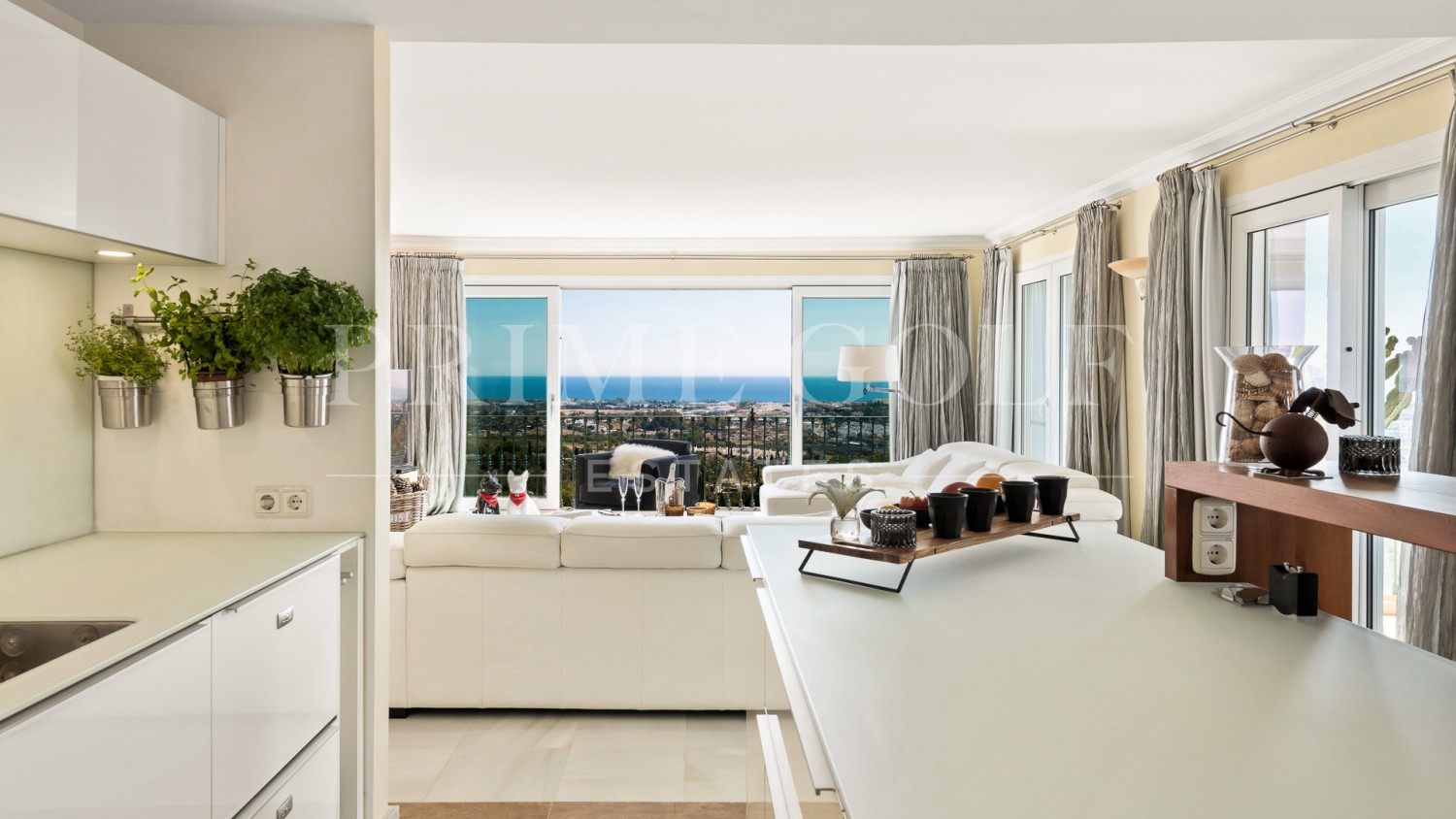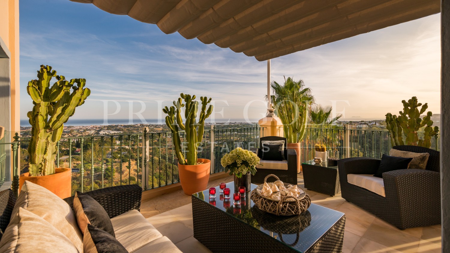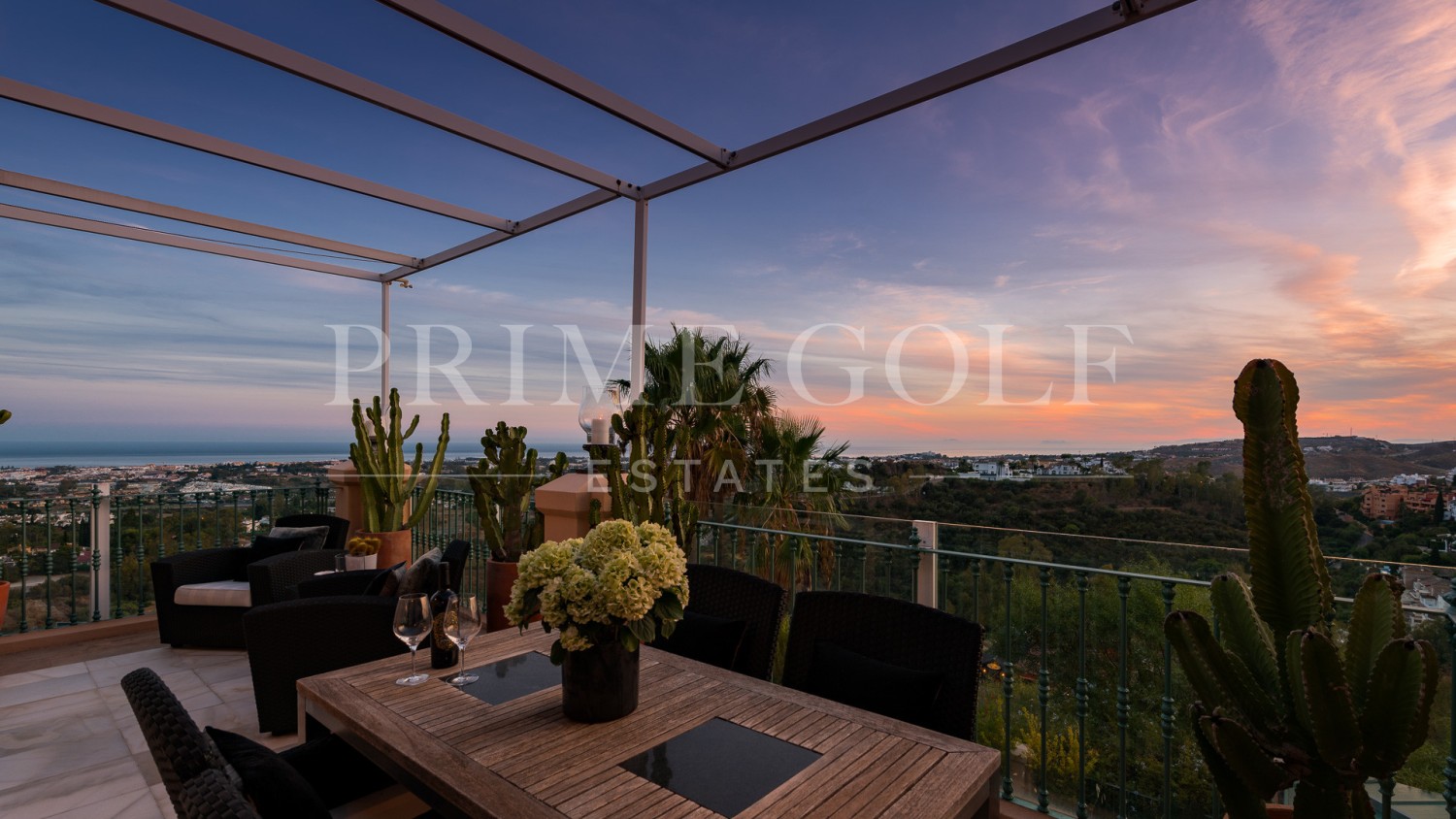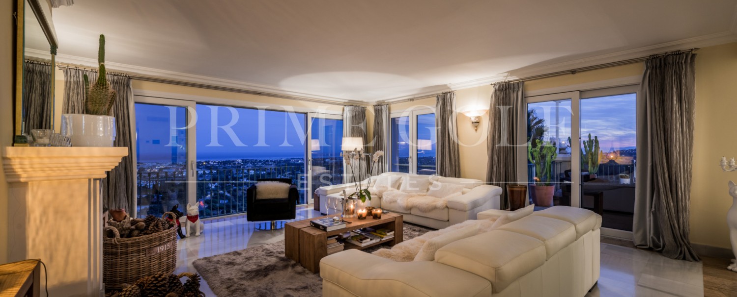 This beautiful penthouse sits atop an elevated position on the edge of a cliff that provides the home with mouth-watering sea and mountain views that stretch beyond Gibraltar and the African coastline. Known as the "penthouse in the sky", the property showcases a perfect blend of traditional Mediterranean architecture with modern design elements and upgrades and the result is a home of exceptional comfort and beauty. Its curving layout allows natural light to liven up the interiors while the lush backdrop of sea and mountains provide an immediate sensation of exclusivity and luxury. Entering the home on its main level there is an entry hall that leads into all the living quarters on this floor. Straight ahead there is a well-appointed living room with a dining area and a modern, upgraded kitchen ideally laid out in a spacious open plan. The large windows allow the beautiful views to be admired from inside the home. There are two en-suite guest rooms on this level in addition to a home office that can also be used as a bedroom. Directly outside is the main terrace that provides ample space for dining outdoors and enjoying the mouth-watering views. Upstairs there are two more en-suite bedrooms including the spectacular master retreat. This luxurious room boasts access to two terraces, a walk-in dressing room and a luxury bathroom that also benefits from the amazing views of the surroundings. The upstairs terrace also features a sauna and is the perfect place to enjoy the sunsets each evening. Being located in Monte Halcones, the property is protected with 24h gated security. The low-density community features beautifully landscaped gardens and a spectacular pool area offering lots of space to take the sun during the warmer months. The community has a shopping centre with a selection of shops and restaurants within walking distance. The beaches of Guadalmina Baja can be reached in 5 minutes by car, and just 10 minutes to Estepona or Marbella centres. For rentals, the property is rented partially furnished, requiring living room furnishings. There are several top golf courses in the area, and Malaga airport is 45 minutes away.