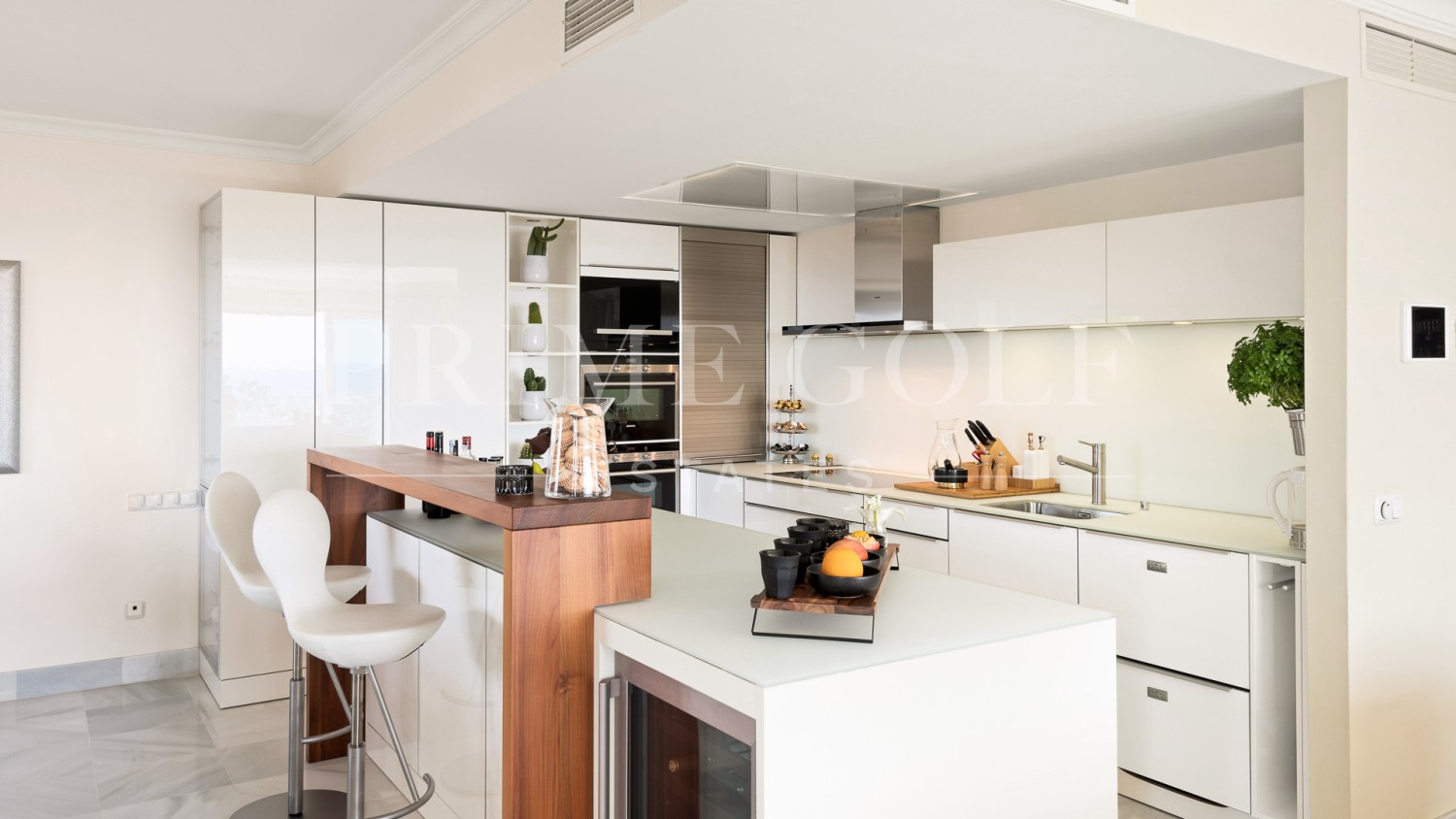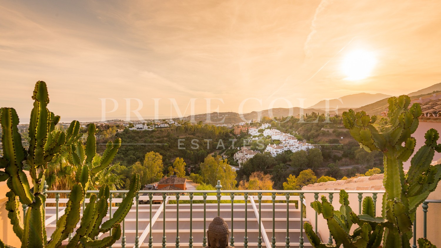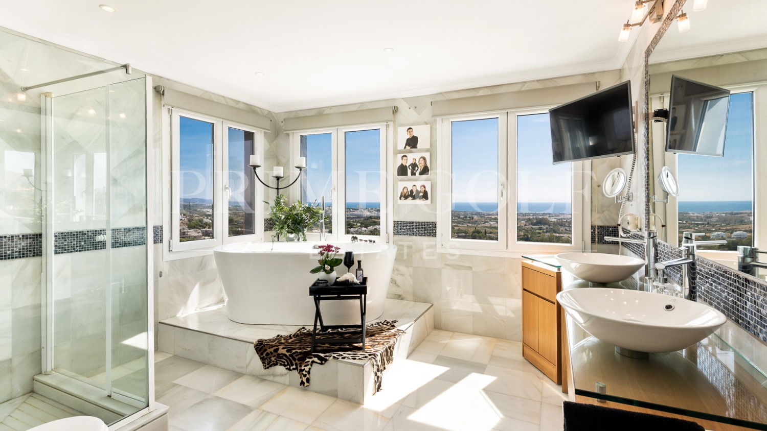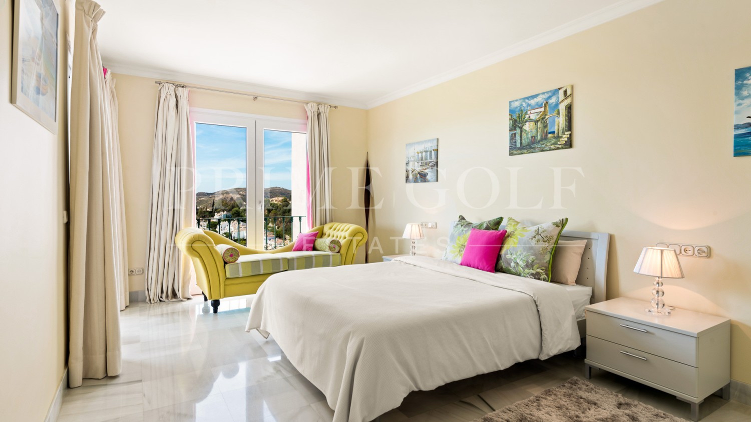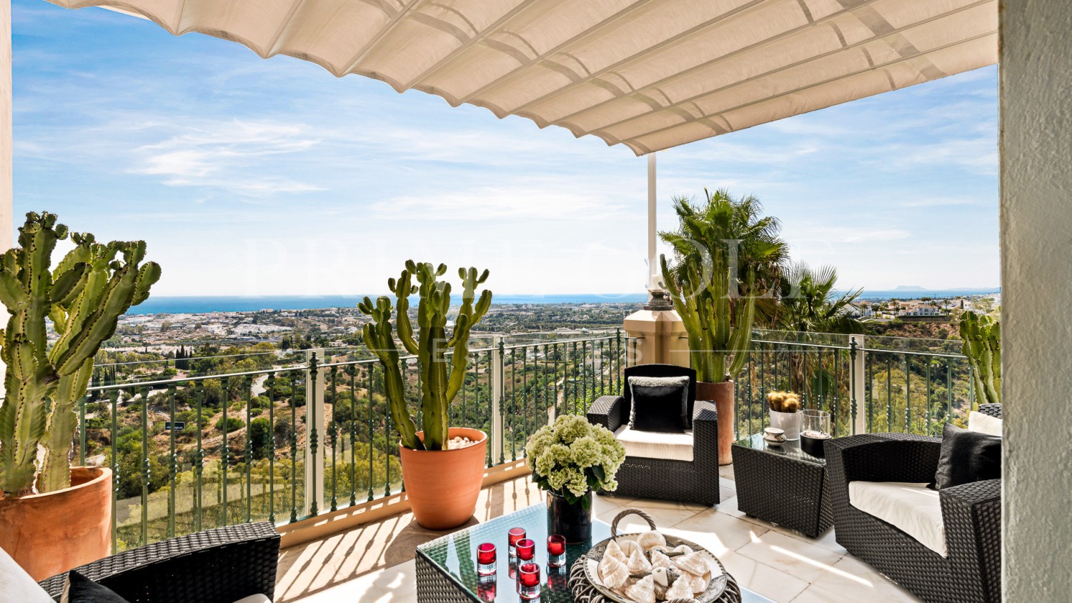 This beautiful penthouse sits atop an elevated position on the edge of a cliff that provides the home with mouth-watering sea and mountain views that stretch beyond Gibraltar and the African coastline. Known as the "penthouse in the sky", the property showcases a perfect blend of traditional Mediterranean architecture with modern design elements and upgrades and the result is a home of exceptional comfort and beauty. Its curving layout allows natural light to liven up the interiors while the lush backdrop of sea and mountains provide an immediate sensation of exclusivity and luxury. Entering the home on its main level there is an entry hall that leads into all the living quarters on this floor. Straight ahead there is a well-appointed living room with a dining area and a modern, upgraded kitchen ideally laid out in a spacious open plan. The large windows allow the beautiful views to be admired from inside the home. There are two en-suite guest rooms on this level in addition to a home office that can also be used as a bedroom. Directly outside is the main terrace that provides ample space for dining outdoors and enjoying the mouth-watering views. Upstairs there are two more en-suite bedrooms including the spectacular master retreat. This luxurious room boasts access to two terraces, a walk-in dressing room and a luxury bathroom that also benefits from the amazing views of the surroundings. The upstairs terrace also features a sauna and is the perfect place to enjoy the sunsets each evening. Being located in Monte Halcones, the property is protected with 24h gated security. The low-density community features beautifully landscaped gardens and a spectacular pool area offering lots of space to take the sun during the warmer months. The community has a shopping centre with a selection of shops and restaurants within walking distance. The beaches of Guadalmina Baja can be reached in 5 minutes by car, and just 10 minutes to Estepona or Marbella centres. For rentals, the property is rented partially furnished, requiring living room furnishings. There are several top golf courses in the area, and Malaga airport is 45 minutes away.