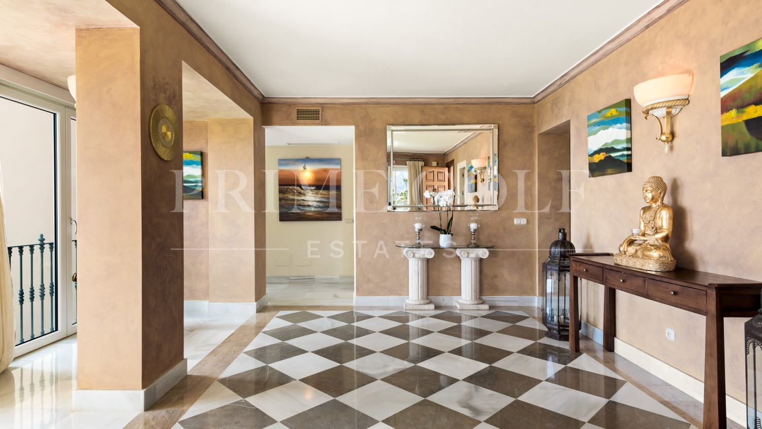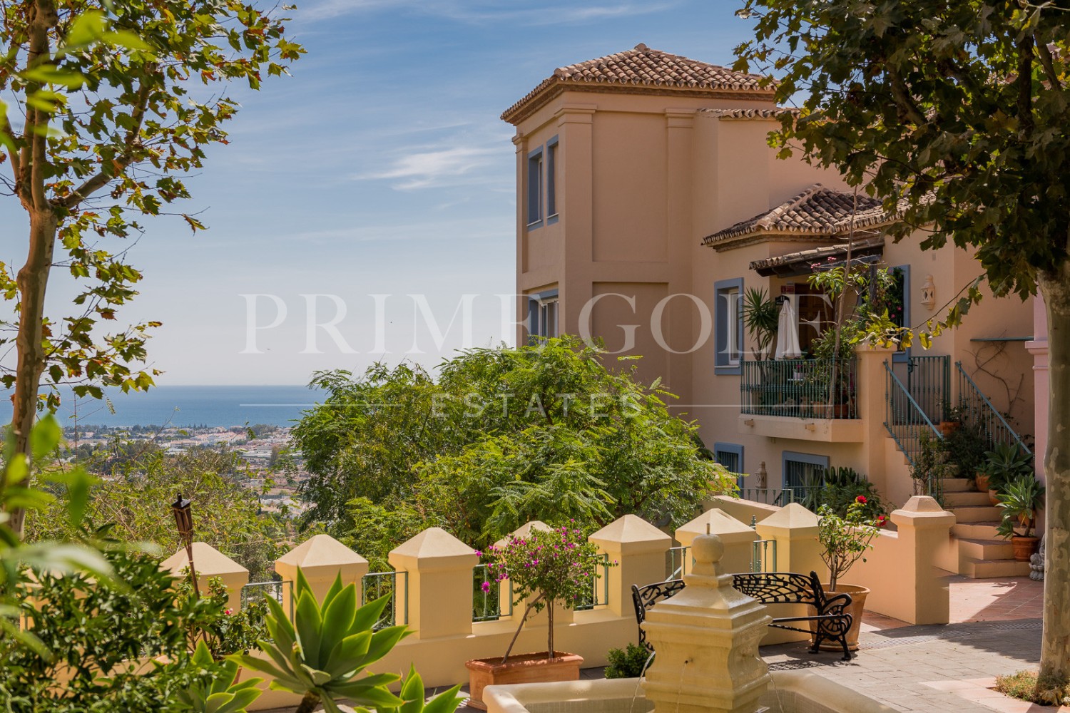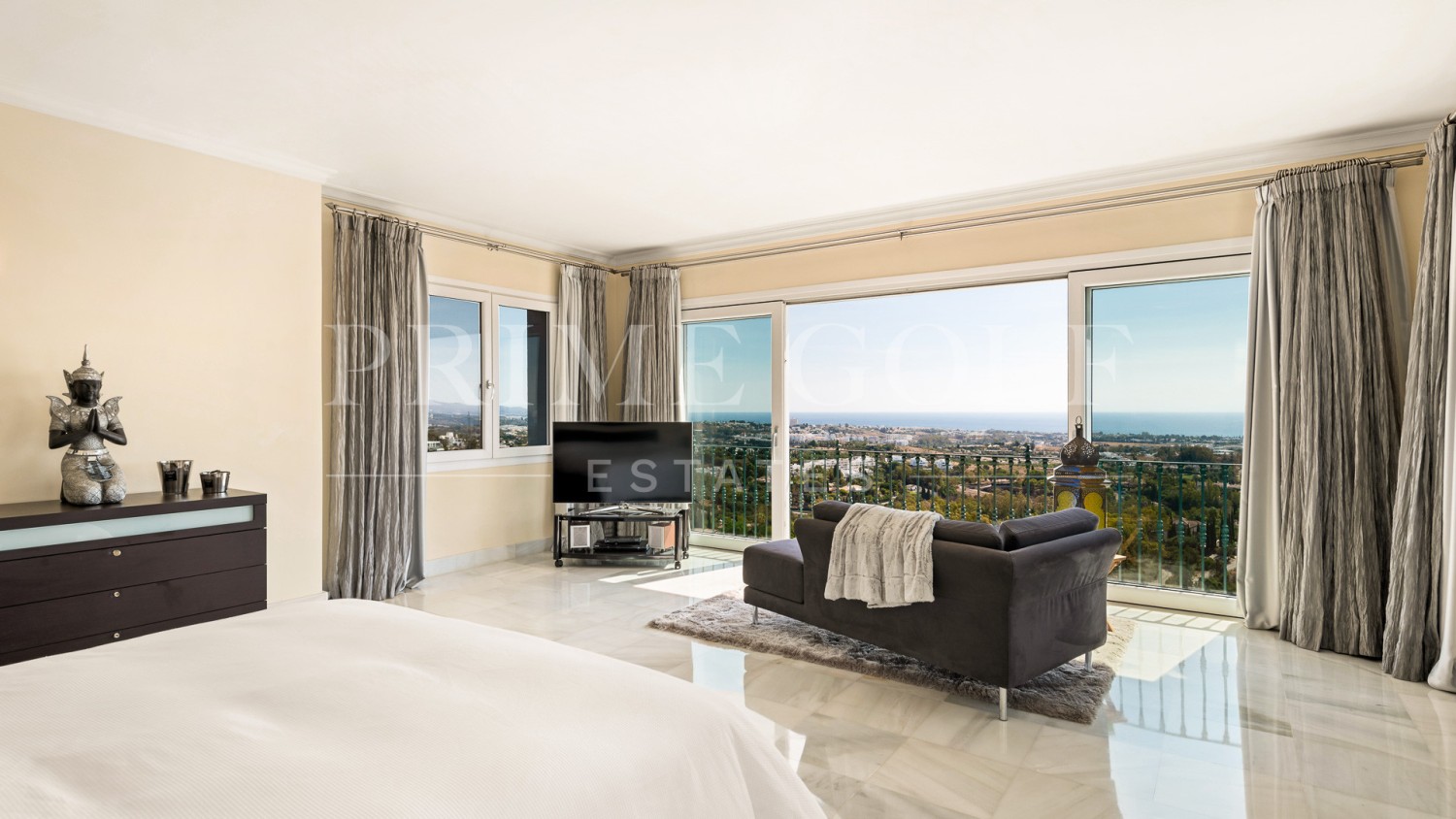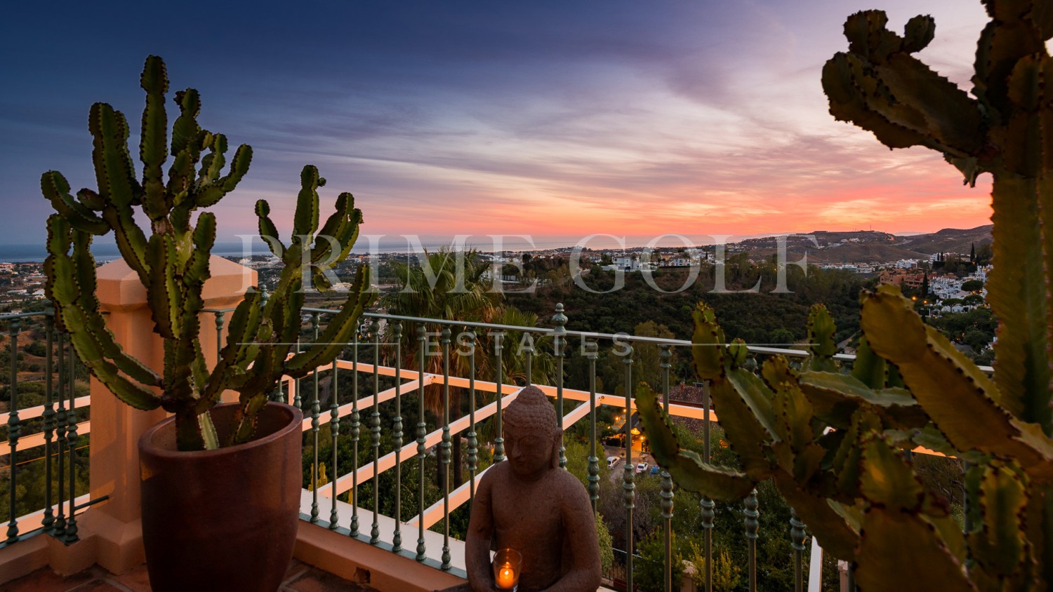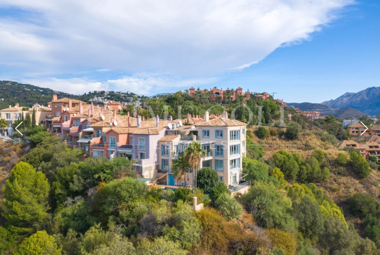 This beautiful penthouse sits atop an elevated position on the edge of a cliff that provides the home with mouth-watering sea and mountain views that stretch beyond Gibraltar and the African coastline. Known as the "penthouse in the sky", the property showcases a perfect blend of traditional Mediterranean architecture with modern design elements and upgrades and the result is a home of exceptional comfort and beauty. Its curving layout allows natural light to liven up the interiors while the lush backdrop of sea and mountains provide an immediate sensation of exclusivity and luxury. Entering the home on its main level there is an entry hall that leads into all the living quarters on this floor. Straight ahead there is a well-appointed living room with a dining area and a modern, upgraded kitchen ideally laid out in a spacious open plan. The large windows allow the beautiful views to be admired from inside the home. There are two en-suite guest rooms on this level in addition to a home office that can also be used as a bedroom. Directly outside is the main terrace that provides ample space for dining outdoors and enjoying the mouth-watering views. Upstairs there are two more en-suite bedrooms including the spectacular master retreat. This luxurious room boasts access to two terraces, a walk-in dressing room and a luxury bathroom that also benefits from the amazing views of the surroundings. The upstairs terrace also features a sauna and is the perfect place to enjoy the sunsets each evening. Being located in Monte Halcones, the property is protected with 24h gated security. The low-density community features beautifully landscaped gardens and a spectacular pool area offering lots of space to take the sun during the warmer months. The community has a shopping centre with a selection of shops and restaurants within walking distance. The beaches of Guadalmina Baja can be reached in 5 minutes by car, and just 10 minutes to Estepona or Marbella centres. For rentals, the property is rented partially furnished, requiring living room furnishings. There are several top golf courses in the area, and Malaga airport is 45 minutes away.