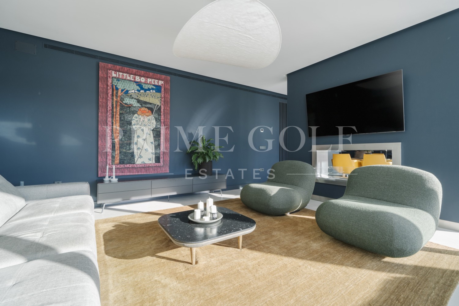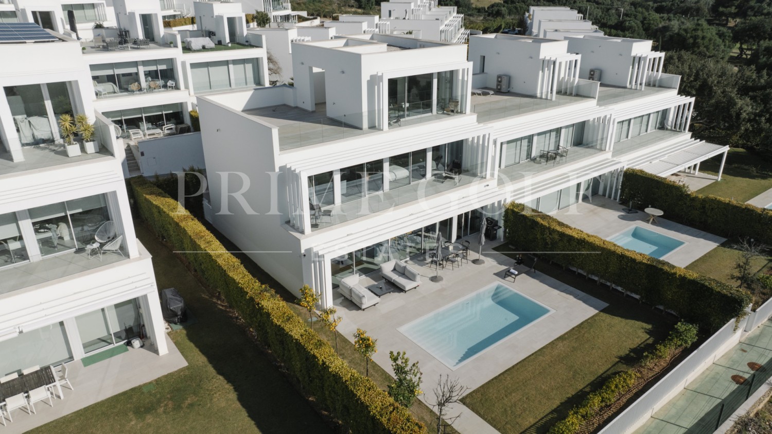 Frontline golf. Sea views. Silence. Security. This three-floor villa sits within a renowned gated community in Sotogrande. Designed for modern living, its five-bedroom layout is ideal for families. Unlike most homes in this neighbourhood, the entrance is at ground level, allowing seamless indoor-outdoor flow between the living space, garden, and pool.