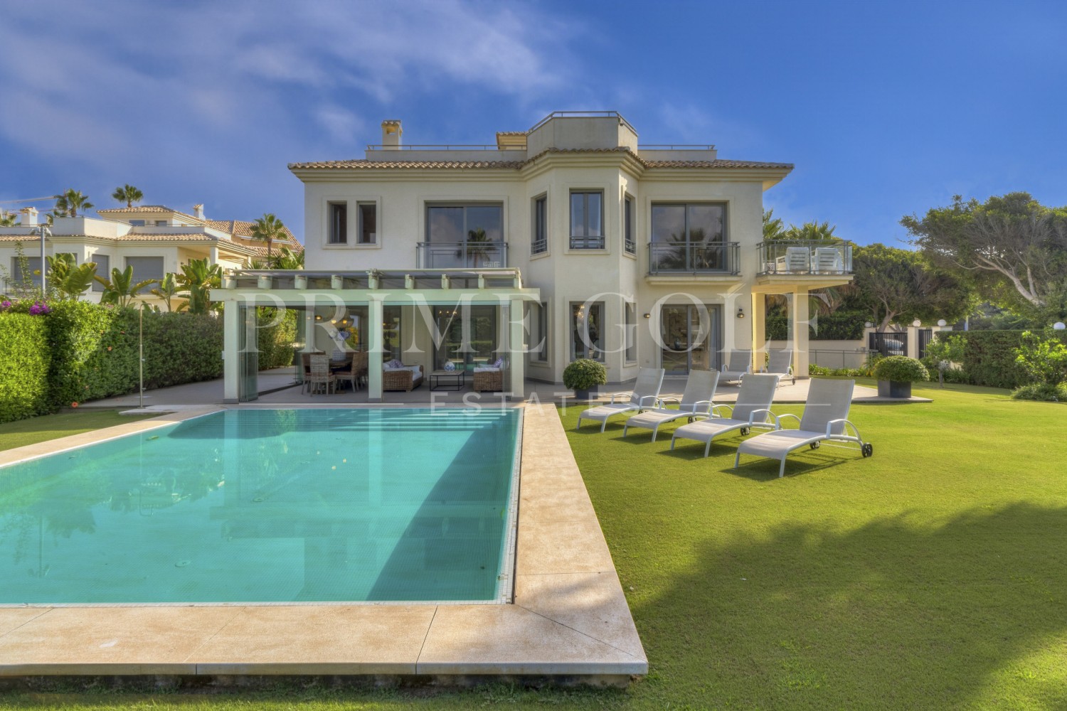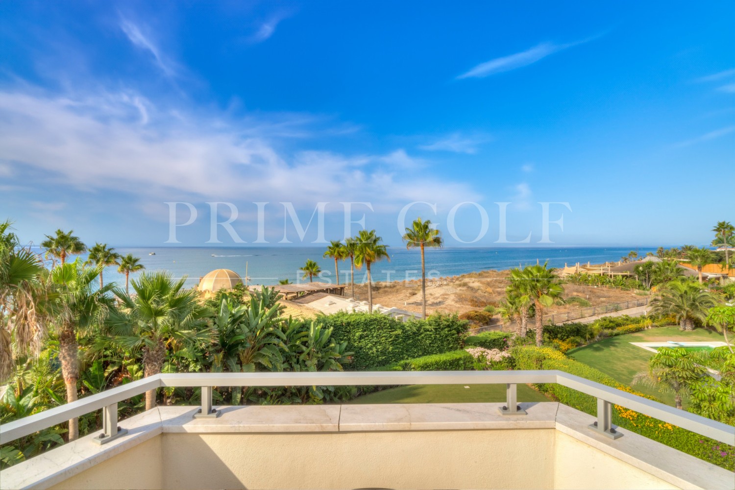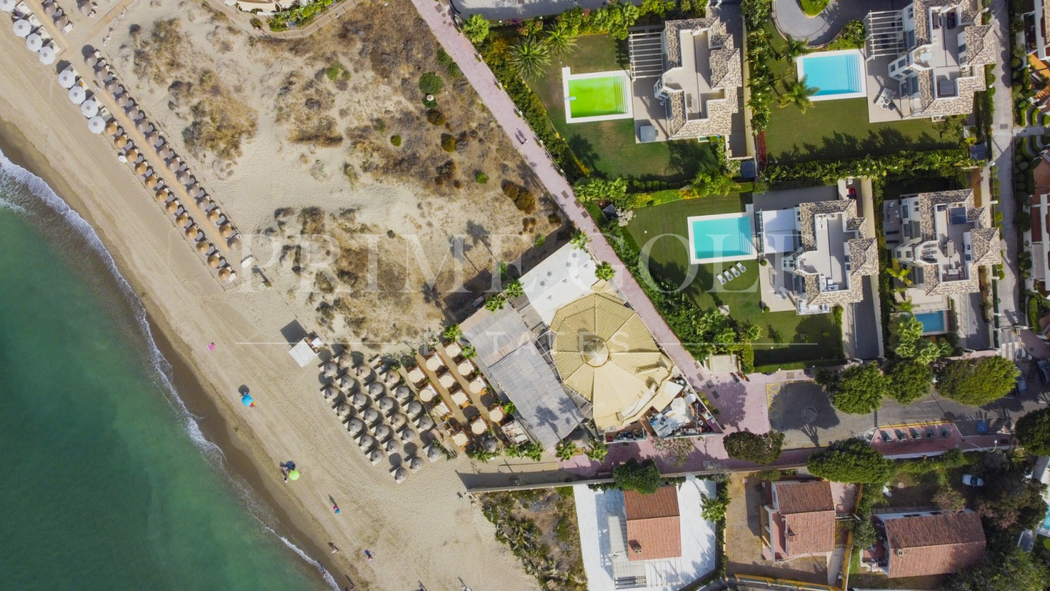 Immaculate five bedroom, south facing beachfront villa located in El Rosario, Marbella East. This luxury villa offers breathtaking sea views and direct access to the beach. The property is set on a generous flat plot of 1,016.23m² which has been beautifully landscaped with a private heated pool and an automatic cover. The property is distributed over three levels plus solarium. The lower level gives access to a self-contained apartment and the garage. The entrance level has a stunning open plan living and dining area; fully fitted open plan kitchen with modern appliances; laundry area; a guest suite; and a guest toilet. From this level you have access to the terrace and garden, with part of the terrace enclosed with glass curtains, making it the perfect space for outside living in the cooler months. The first floor leads to two guest suites; and the master suite with beautiful sea views. The upper-level gives access to the spacious solarium; a tranquil area where you can relax and listen to the sound of the waves or entertain guests. Other features include an elevator that connects all levels, fitted wardrobes, double garage, underfloor heating in the bathrooms, hot and cold air conditioning, solar panels, domotic system, alarm system and security cameras. With its prime beachfront location this villa is a dream home close to schools, and amenities; perfect for year-round living or as an investment for rentals.