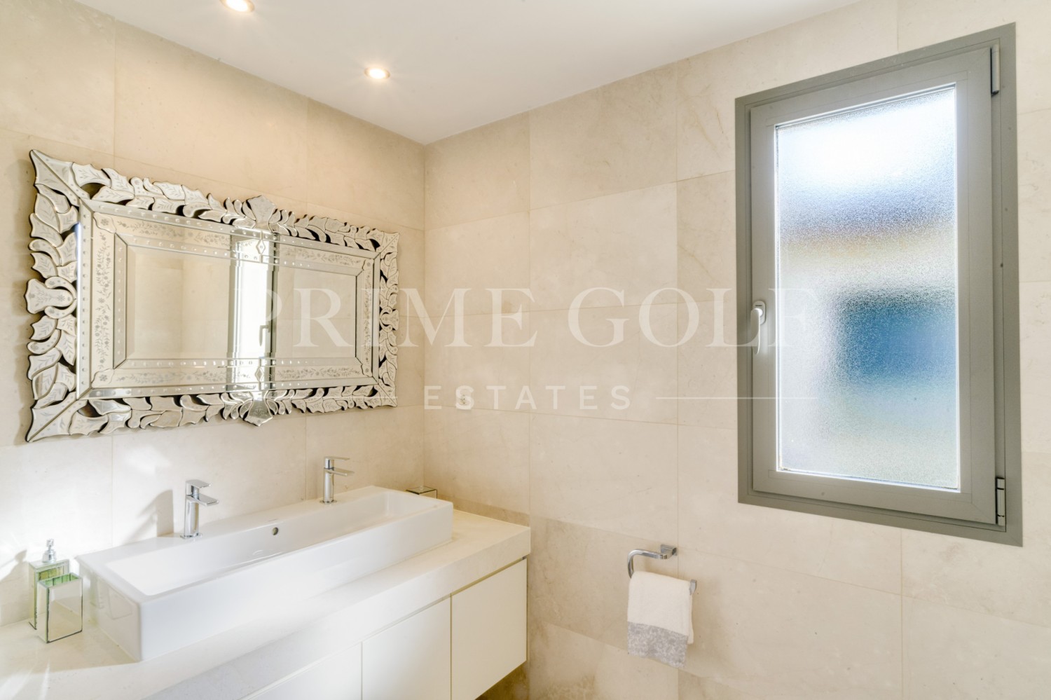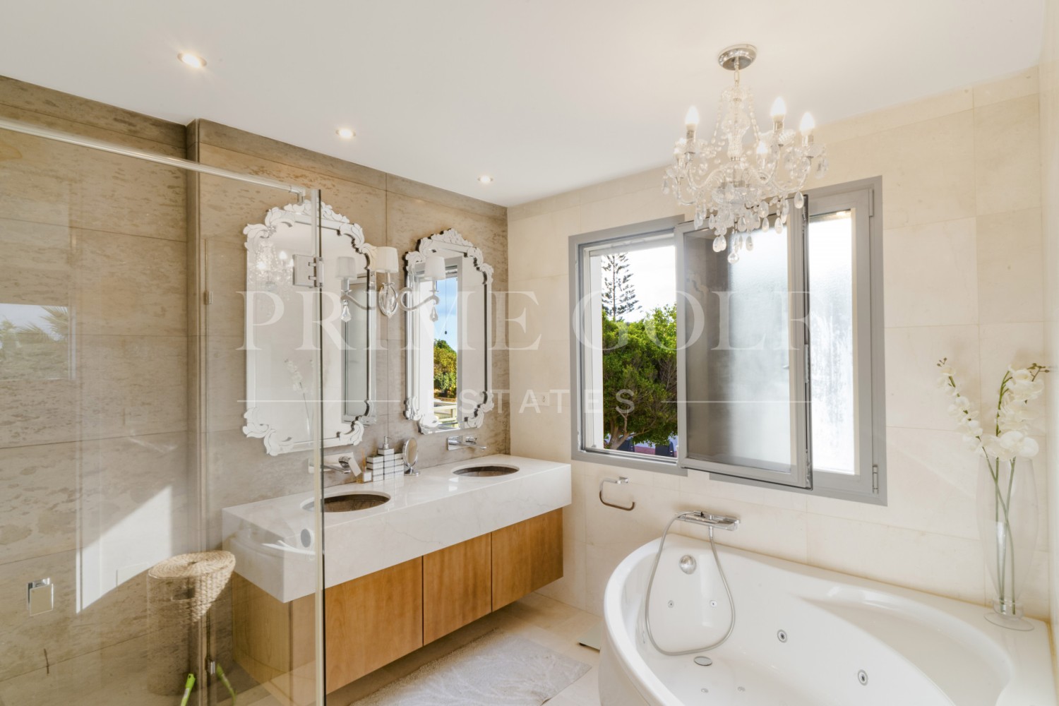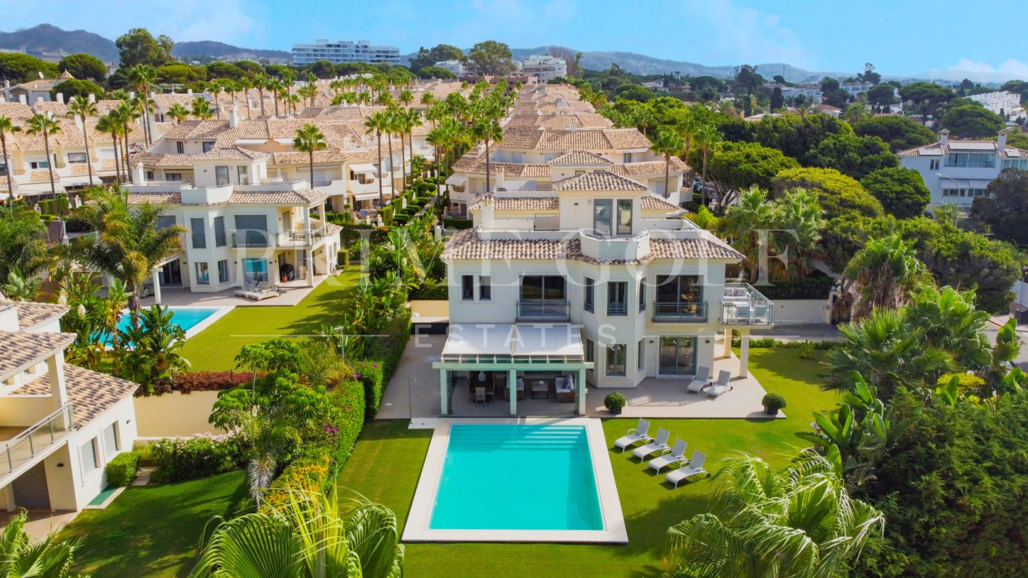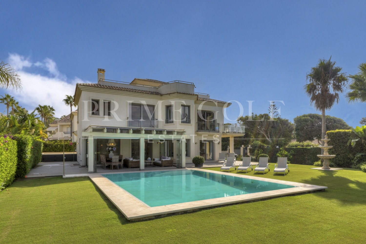 Immaculate five bedroom, south facing beachfront villa located in El Rosario, Marbella East. This luxury villa offers breathtaking sea views and direct access to the beach. The property is set on a generous flat plot of 1,016.23m² which has been beautifully landscaped with a private heated pool and an automatic cover. The property is distributed over three levels plus solarium. The lower level gives access to a self-contained apartment and the garage. The entrance level has a stunning open plan living and dining area; fully fitted open plan kitchen with modern appliances; laundry area; a guest suite; and a guest toilet. From this level you have access to the terrace and garden, with part of the terrace enclosed with glass curtains, making it the perfect space for outside living in the cooler months. The first floor leads to two guest suites; and the master suite with beautiful sea views. The upper-level gives access to the spacious solarium; a tranquil area where you can relax and listen to the sound of the waves or entertain guests. Other features include an elevator that connects all levels, fitted wardrobes, double garage, underfloor heating in the bathrooms, hot and cold air conditioning, solar panels, domotic system, alarm system and security cameras. With its prime beachfront location this villa is a dream home close to schools, and amenities; perfect for year-round living or as an investment for rentals.