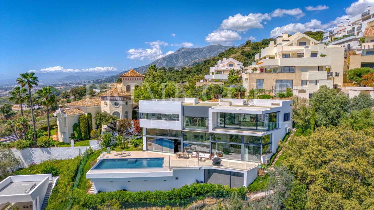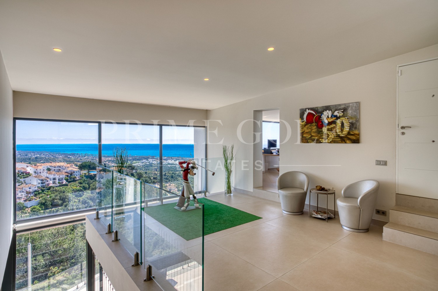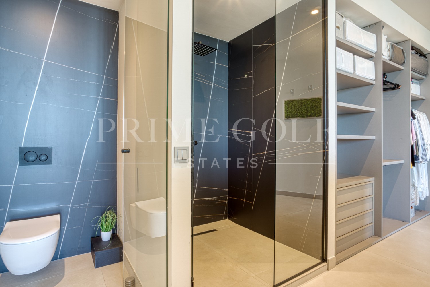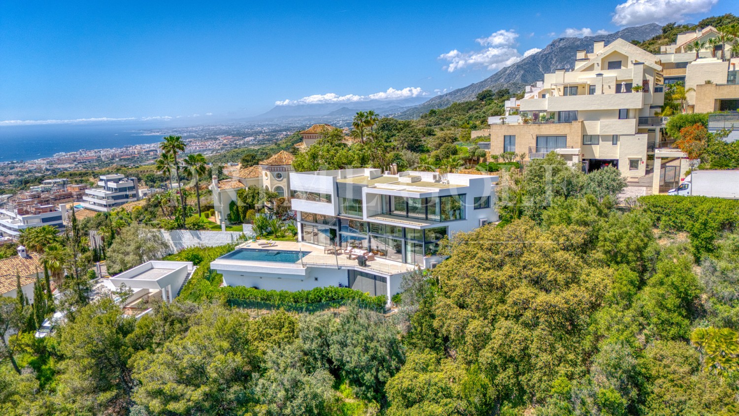 Perched in the tranquil hills of Altos de Los Monteros, just a short drive from Marbella’s centre and the beach. This three storey designer villa marries top-quality materials and uninterrupted sea views through floor-to-ceiling windows. A dramatic staircase or private elevator leads down into an open living and kitchen space that flows seamlessly onto a sprawling terrace with heated infinity pool, including a pool cover. Above, the master suite enjoys its own terrace, spa-style ensuite and a bright office, while the middle level hosts a second ensuite bedroom. The lower floor offers two further ensuite bedrooms, two generous storage rooms and a laundry room. Other features include; water-based underfloor heating, aerothermal climate control, electric blinds and a secure carport for two cars. This property has been meticulously specified to deliver the ultimate in contemporary luxury living.