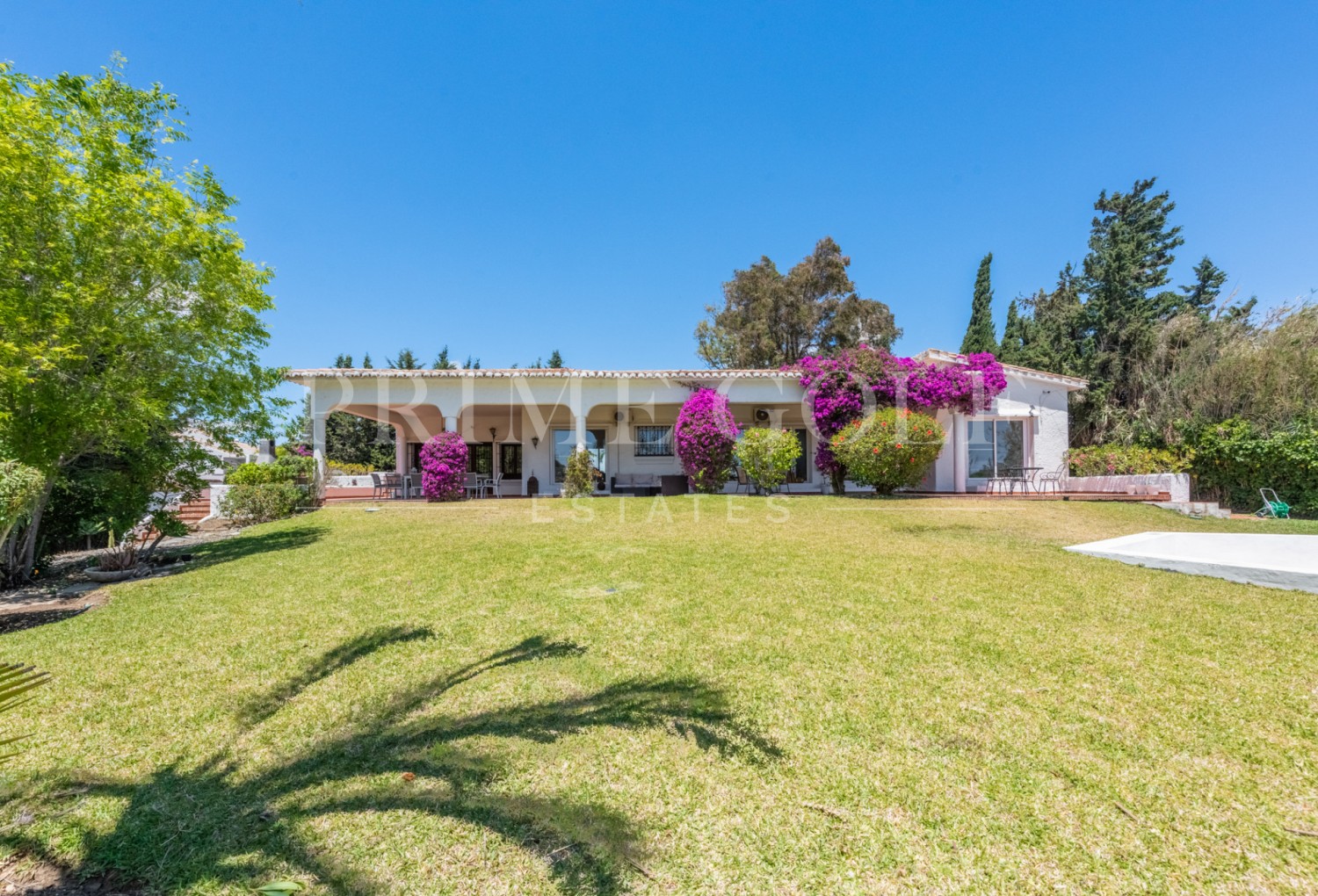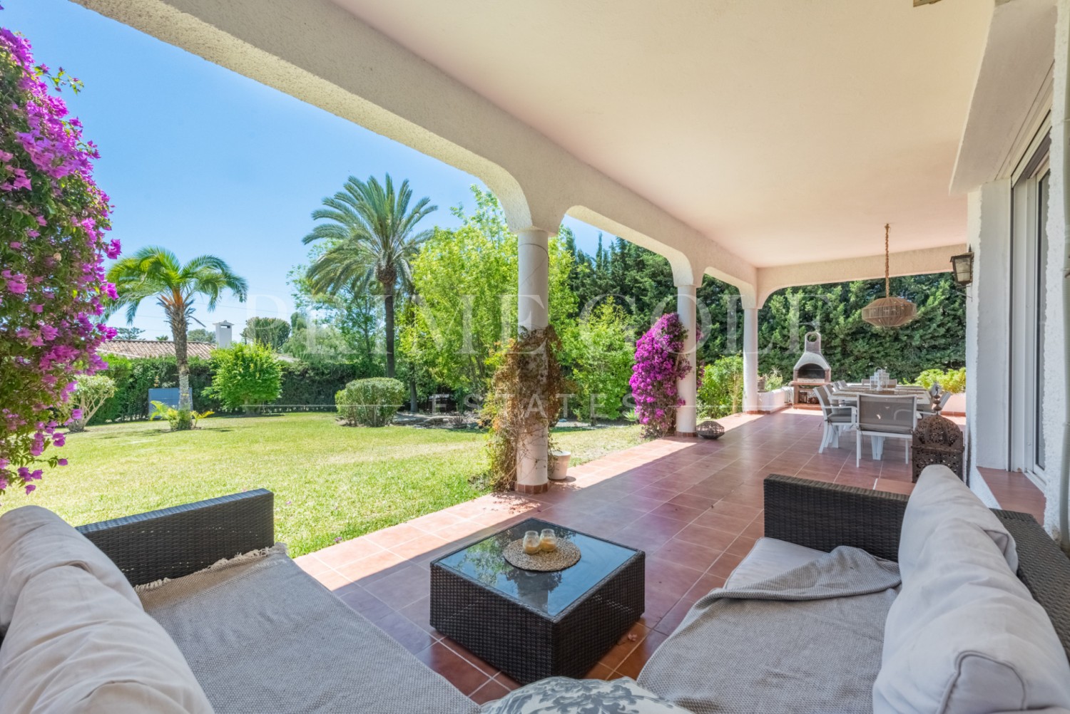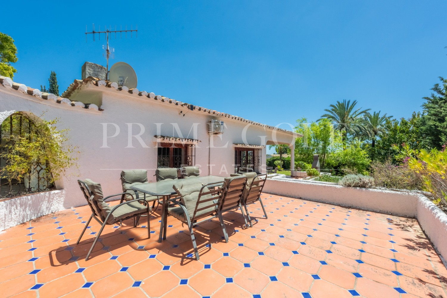 Enchanting Andalusian-style villa boasting a sprawling garden, ideally situated within walking distance of Atalaya Golf. Bathed in sunlight, the villa is designed on a single level, with an expansive garage nestled on the basement floor. Enjoy unparalleled privacy as the property is secluded and not overlooked.