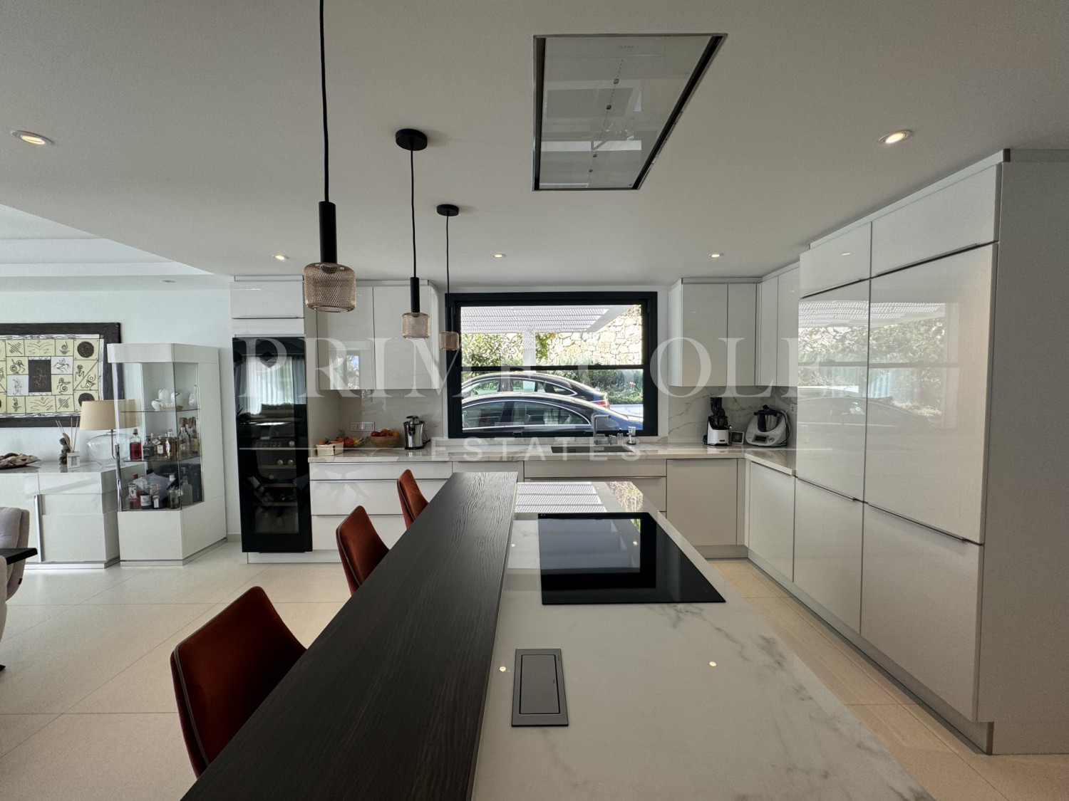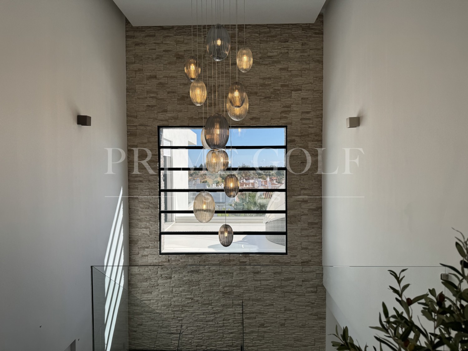 Built to the highest standards, this sleek, contemporary 2 storey villa boasts six bedrooms, five bathrooms, and a guest toilet. The spacious open-plan living area features a modern kitchen, dining space, and a cozy fireplace, all seamlessly flowing onto the sun-drenched terrace. The villa is equipped with underfloor heating throughout, ensuring year-round comfort.