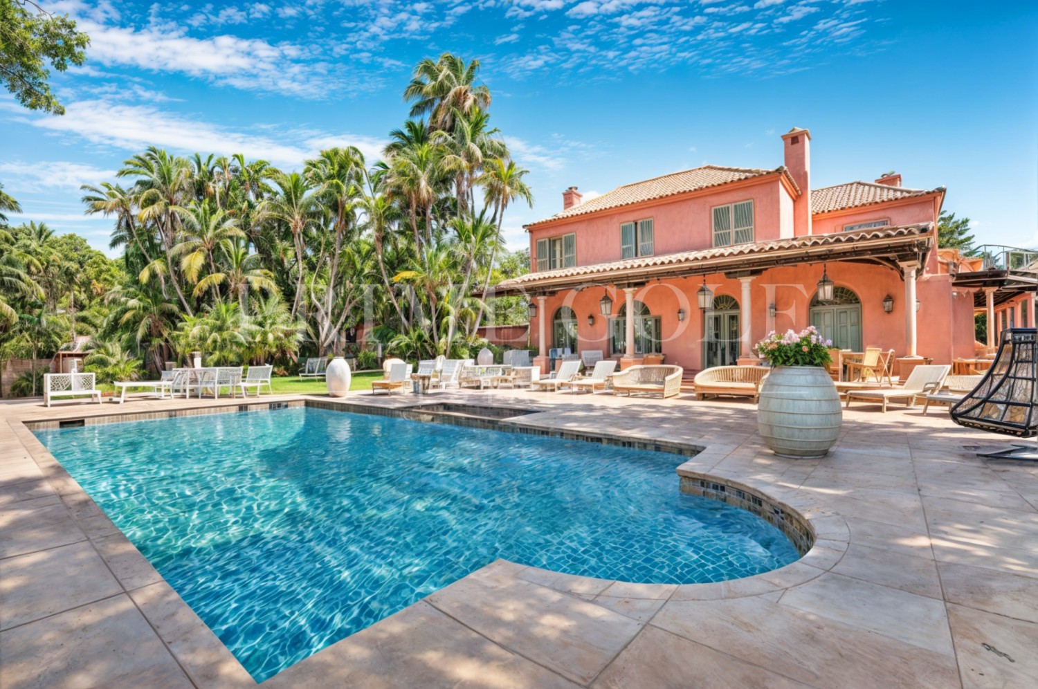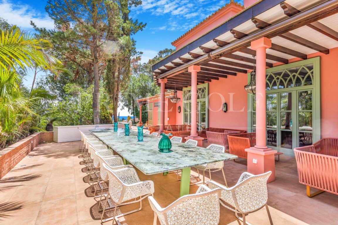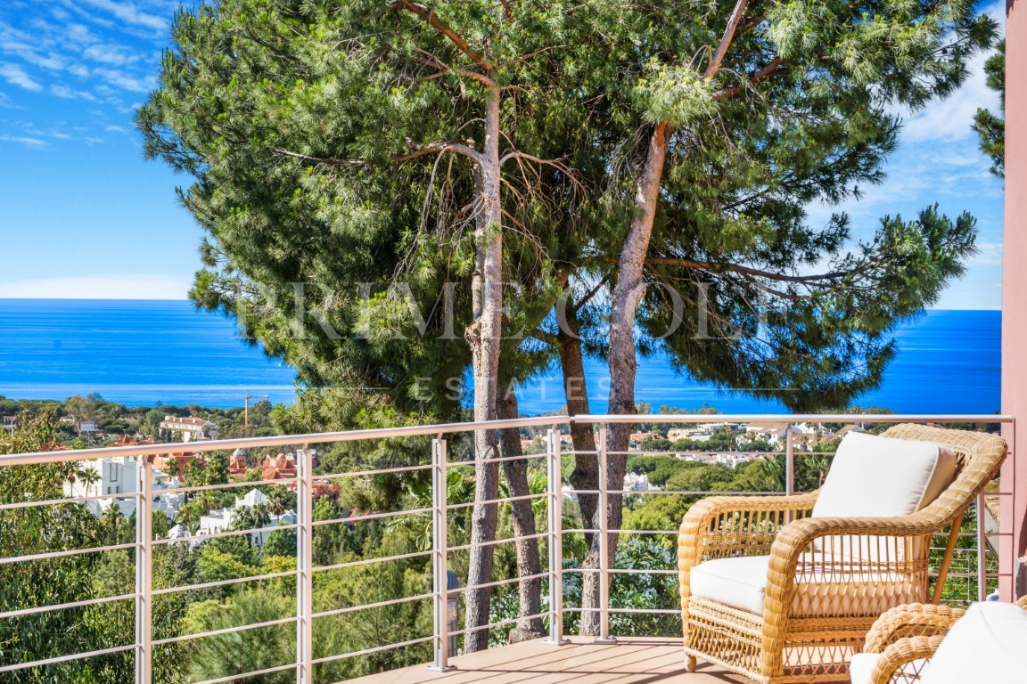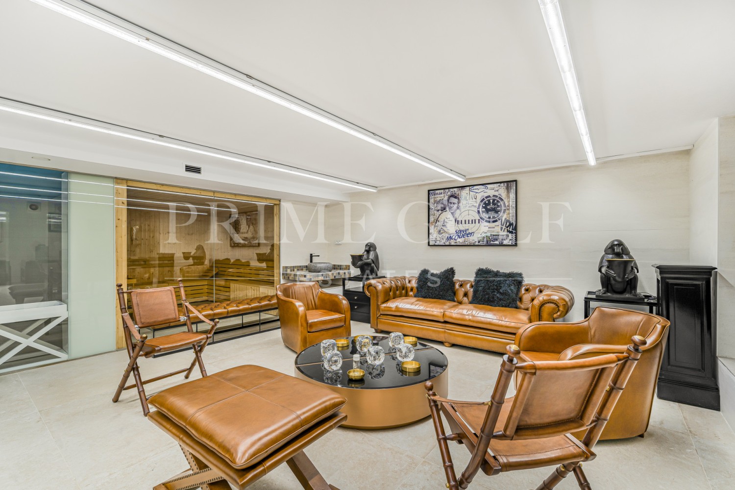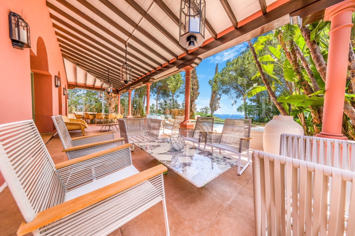 Magnificent six bedroom Villa located in Hacienda Las Chapas, Marbella. This property is close to amenities, golf courses and the beach, with only a short ten minute drive to Marbella. The villa boasts spectacular sea views from both the ground floor and first floor; the entrance level has a spacious open plan living and dining room with built in fireplace, lounge and access to the terrace, garden and private swimming pool; fully fitted kitchen; guest suite; and a guest toilet. The first floor has the master suite with walk in closet and spacious terrace with beautiful views to the sea and pool; four guest suites and a terrace with wonderful sea views. The lower level of the property leads to the gym and spa, complete with bathroom, sauna and Hamam. There is also a storage room; laundry room; and lounge area on this level. Other features include hot and cold air conditioning, double car port, fitted wardrobes and solar panels. There is also an approved project to add an independent guest house of 130m2 with three bedrooms and bathrooms.
