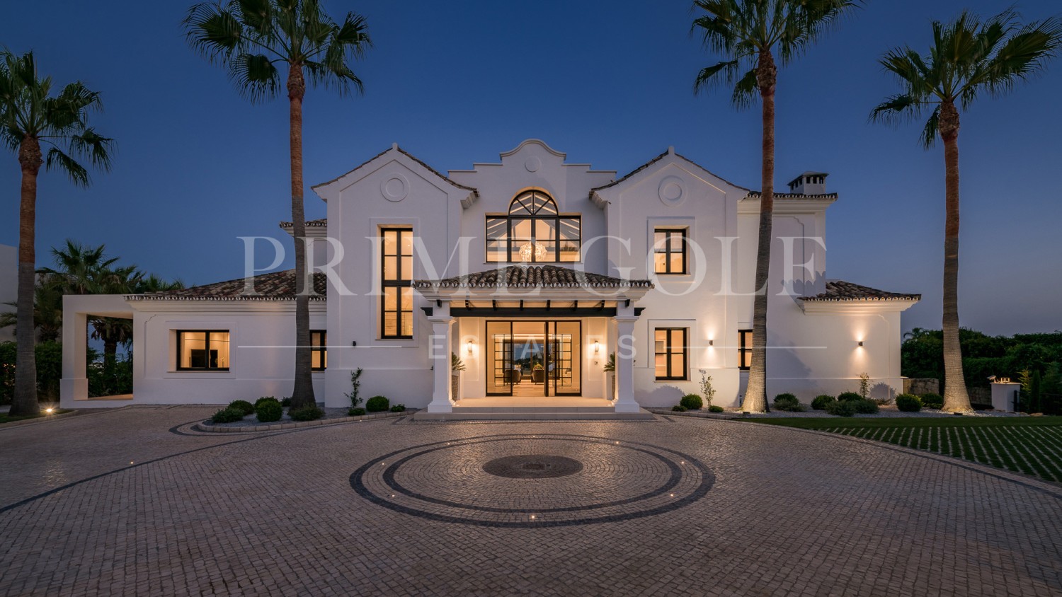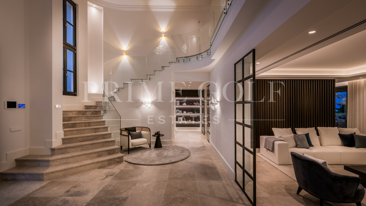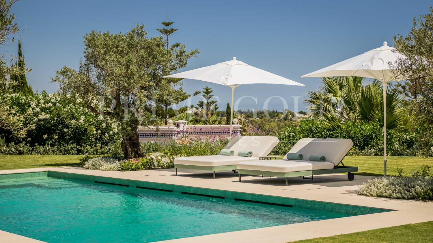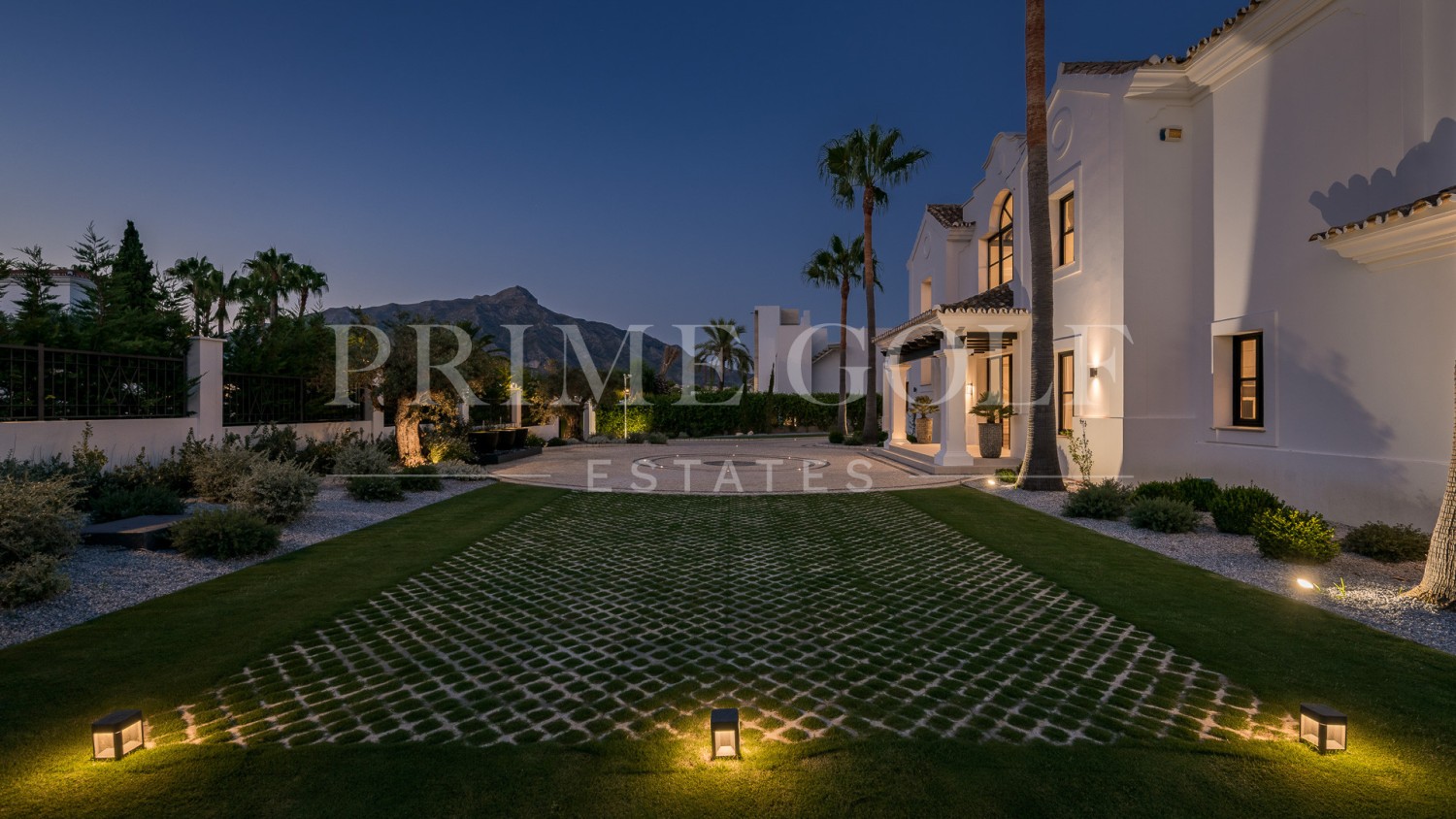 A timeless, beautiful property for sale in the prestigious community of La Cerquilla, Nueva Andalucia. Recently completely reformed to a very high standard, this stunning property is situated on the top street of La Cerquilla. It commands panoramic views over the golf valley towards the sea. The property is over 1,000m2, built over 3 levels, and sits on a plot of nearly 3,000m2, making it one of the largest villas available in La Cerquilla. An impressive entrance courtyard with room for several cars leads to a spacious entrance with a double-height ceiling and remarkable views of the sea. The hall leads directly into a spacious living room with fantastic sea views, a dining area that faces the sea, and a large open-plan kitchen with an adjacent TV / family room. These rooms overlook the sea and lead directly to the main covered terrace with an in-built barbecue and room for outside dining and lounging. Also on this level are 3 double bedrooms with en suite bathrooms and private dressing areas; one guest bedroom faces the garden, whilst the other two face the sea with private outdoor terraces.