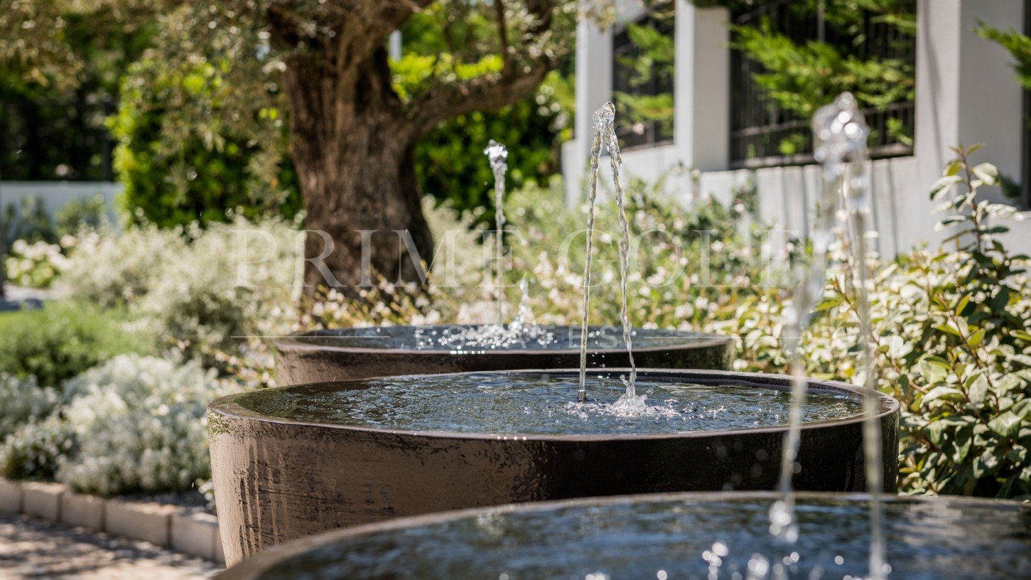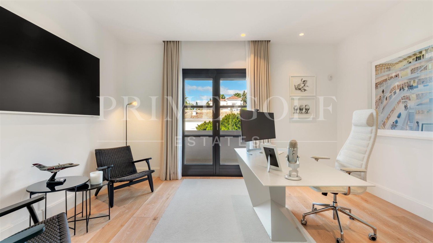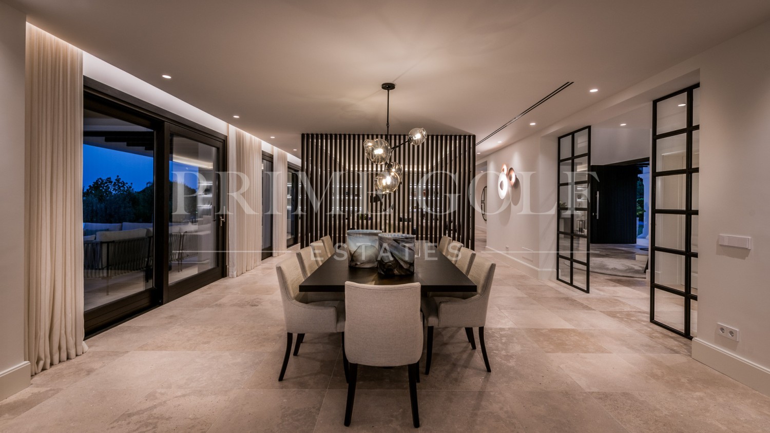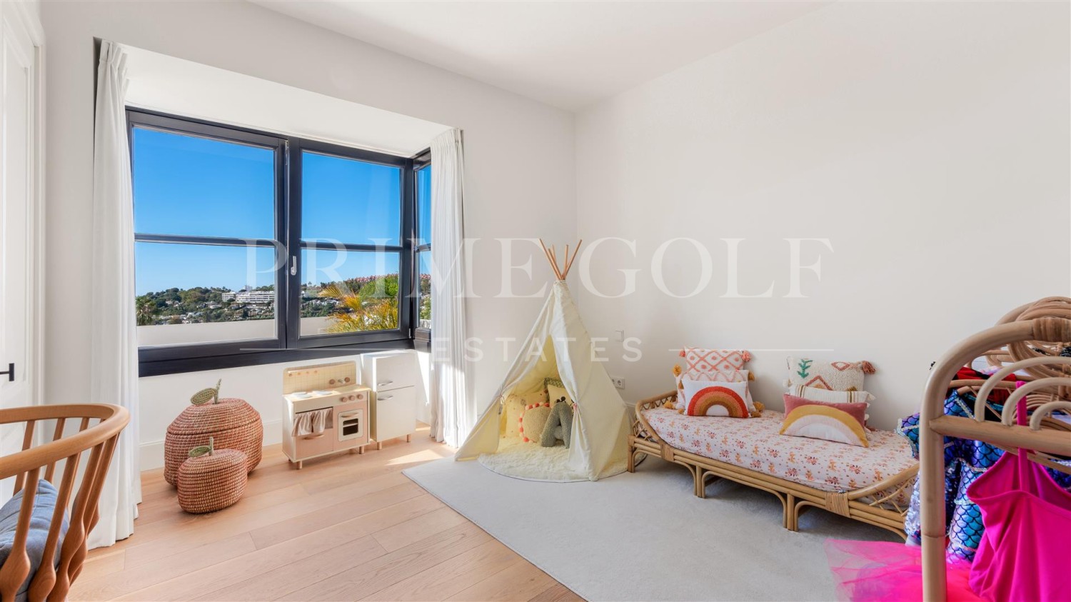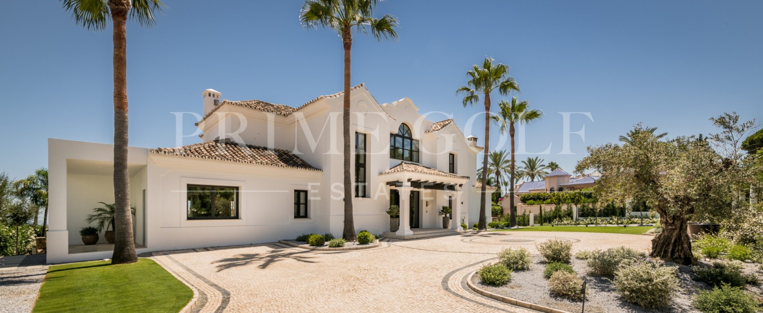 A timeless, beautiful property for sale in the prestigious community of La Cerquilla, Nueva Andalucia. Recently completely reformed to a very high standard, this stunning property is situated on the top street of La Cerquilla. It commands panoramic views over the golf valley towards the sea. The property is over 1,000m2, built over 3 levels, and sits on a plot of nearly 3,000m2, making it one of the largest villas available in La Cerquilla. An impressive entrance courtyard with room for several cars leads to a spacious entrance with a double-height ceiling and remarkable views of the sea. The hall leads directly into a spacious living room with fantastic sea views, a dining area that faces the sea, and a large open-plan kitchen with an adjacent TV / family room. These rooms overlook the sea and lead directly to the main covered terrace with an in-built barbecue and room for outside dining and lounging. Also on this level are 3 double bedrooms with en suite bathrooms and private dressing areas; one guest bedroom faces the garden, whilst the other two face the sea with private outdoor terraces.