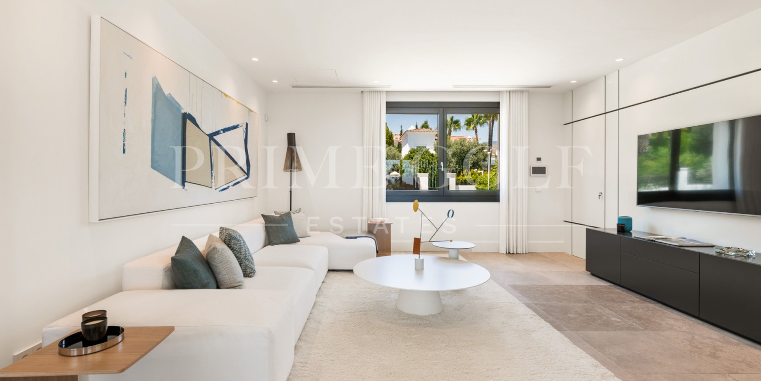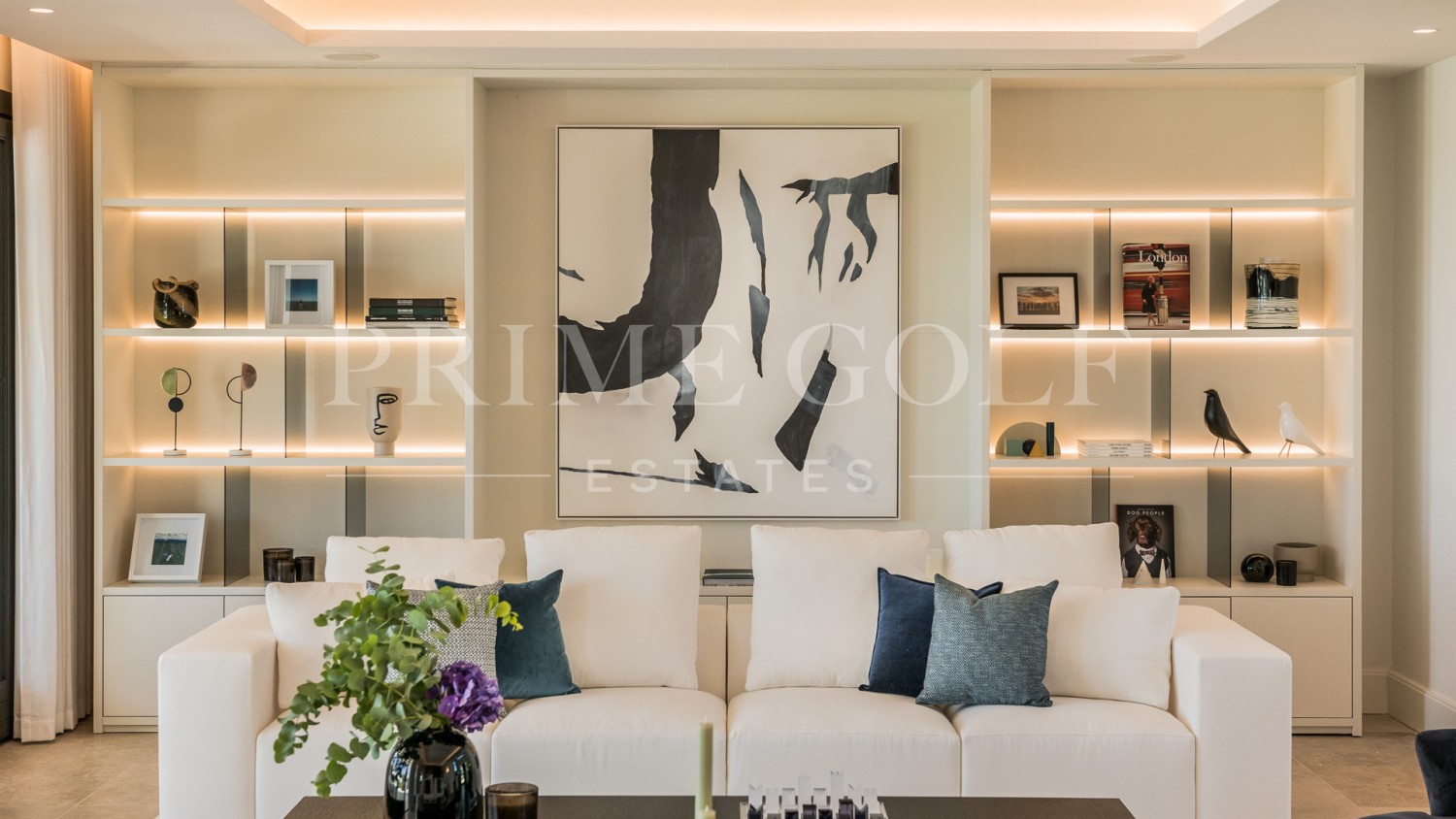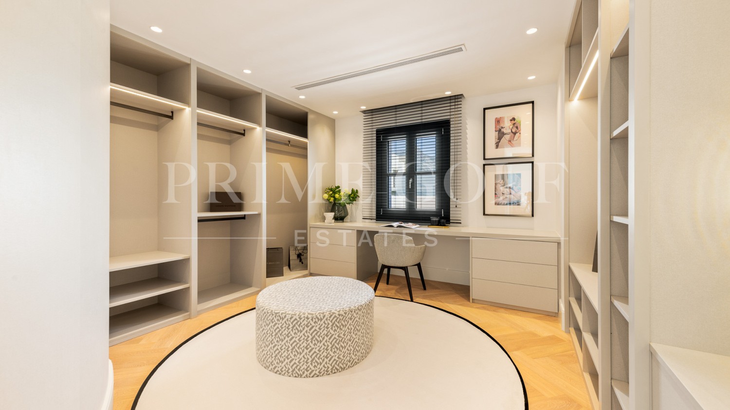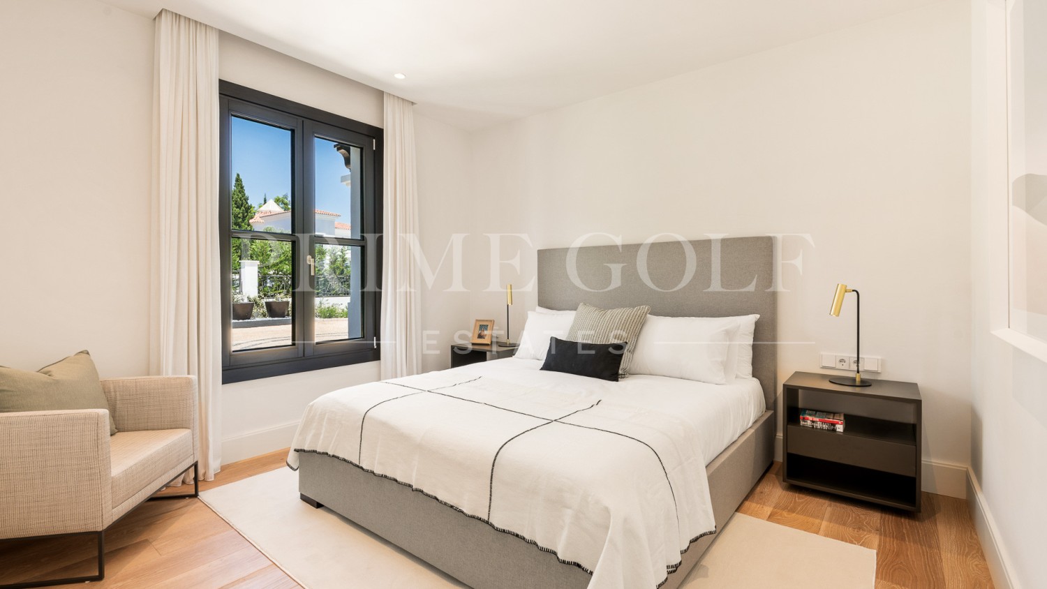 A timeless, beautiful property for sale in the prestigious community of La Cerquilla, Nueva Andalucia. Recently completely reformed to a very high standard, this stunning property is situated on the top street of La Cerquilla. It commands panoramic views over the golf valley towards the sea. The property is over 1,000m2, built over 3 levels, and sits on a plot of nearly 3,000m2, making it one of the largest villas available in La Cerquilla. An impressive entrance courtyard with room for several cars leads to a spacious entrance with a double-height ceiling and remarkable views of the sea. The hall leads directly into a spacious living room with fantastic sea views, a dining area that faces the sea, and a large open-plan kitchen with an adjacent TV / family room. These rooms overlook the sea and lead directly to the main covered terrace with an in-built barbecue and room for outside dining and lounging. Also on this level are 3 double bedrooms with en suite bathrooms and private dressing areas; one guest bedroom faces the garden, whilst the other two face the sea with private outdoor terraces.