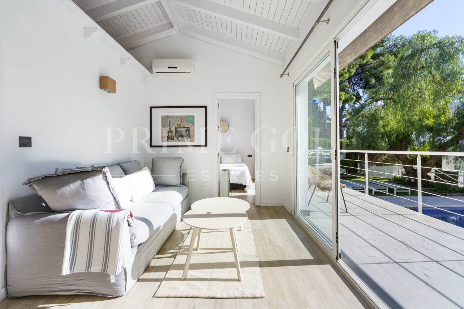 Originally constructed in the 1970s, the villa has been completely reimagined and expanded to include a second floor, a sprawling solarium, and a charming guest house. The main house boasts a contemporary open-plan layout on the ground floor, featuring a spacious living and dining area alongside a premium, fully equipped kitchen. This level also includes three en-suite bedrooms and a guest toilet.