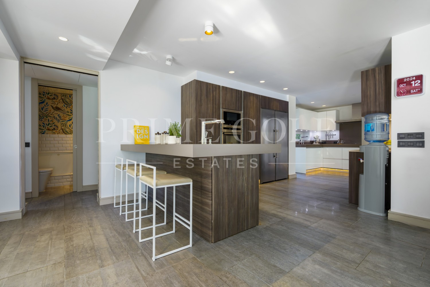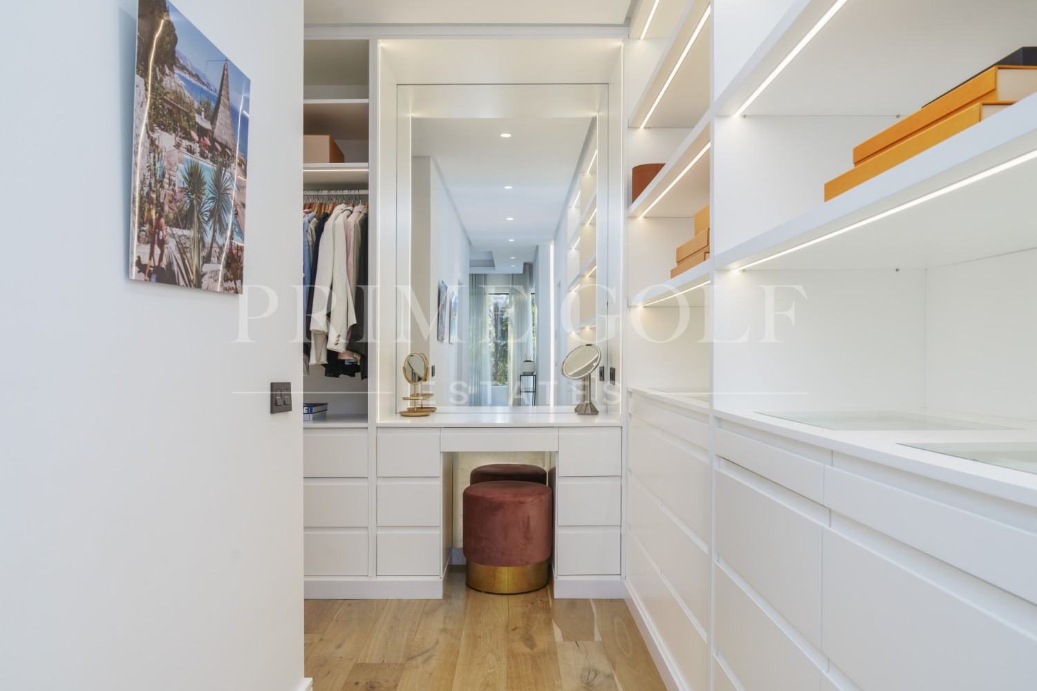 The upper floor offers an additional living space, a guest bedroom with a walk-in closet and en-suite bathroom, and a luxurious master suite complete with a large walk-in wardrobe and an elegant en-suite bathroom. From this floor, you can access the impressive solarium terrace, which offers stunning sea views, ample chill-out areas, and sun decks—perfect for relaxing or entertaining.
