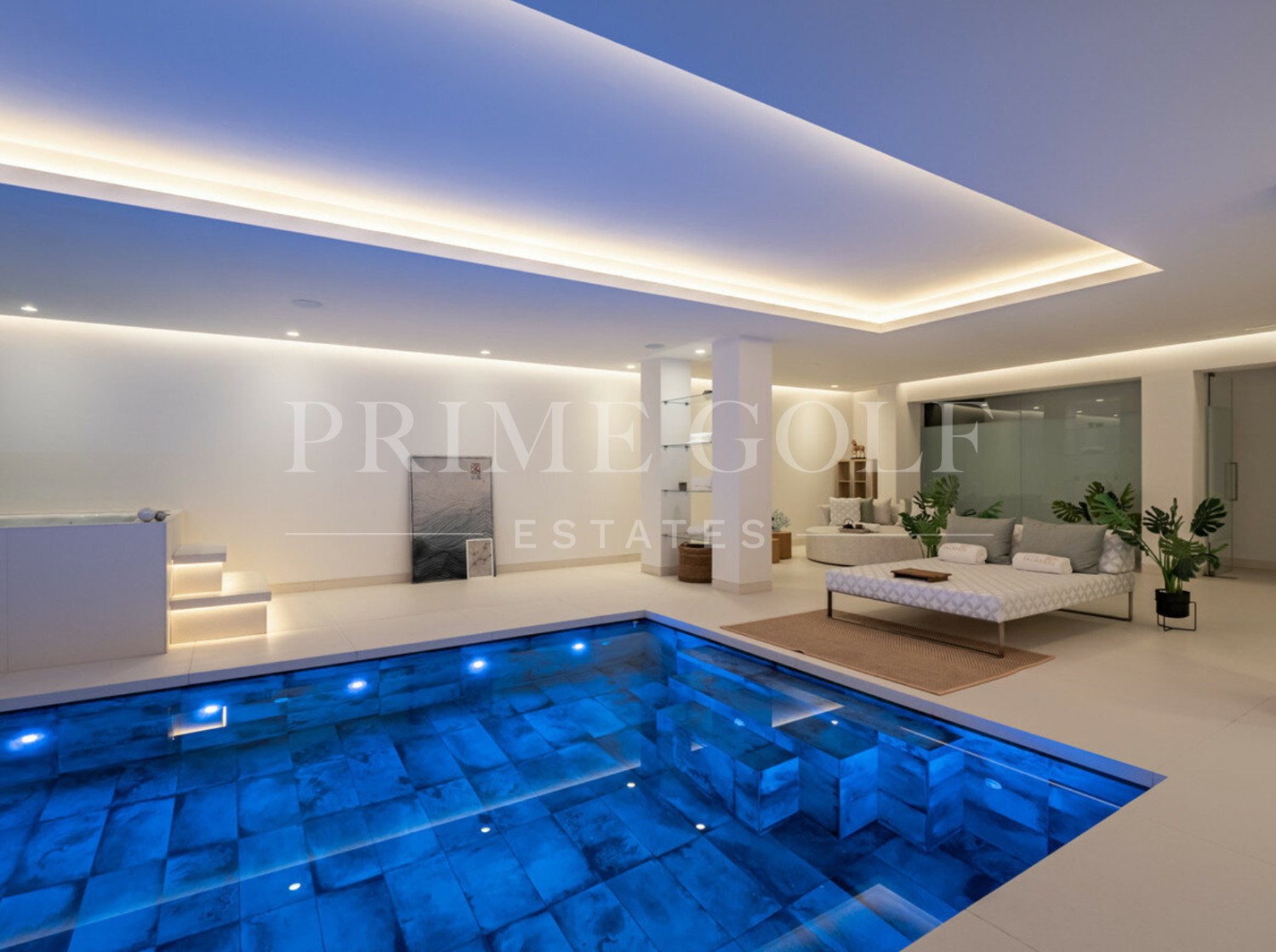 Inside, this house comprises 1.242 m², distributed over two levels plus a lower level, exclusively reserved as an entertainment area with an indoor pool, a state-of-the-art wine cellar, and a fabulous cinema room—the south-orientation grants absolutely stunning panoramic views over the golf course. The villa offers incredible features, such as 7 en-suite bedrooms with dressing rooms, 11 bathrooms; a gorgeous and glamorous living room with outstanding decoration. Furthermore, there’s a library and a dining room that offers direct access to a covered terrace and the incredible garden. The kitchen gets a special mention, blending perfectly and in harmony with the style of this villa, designed by Danespan and equipped with Gaggenau appliances.