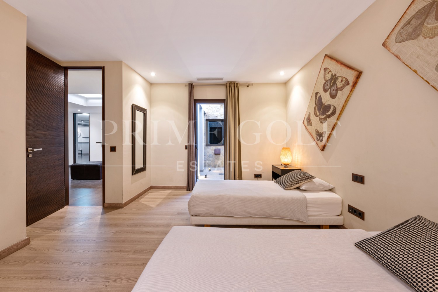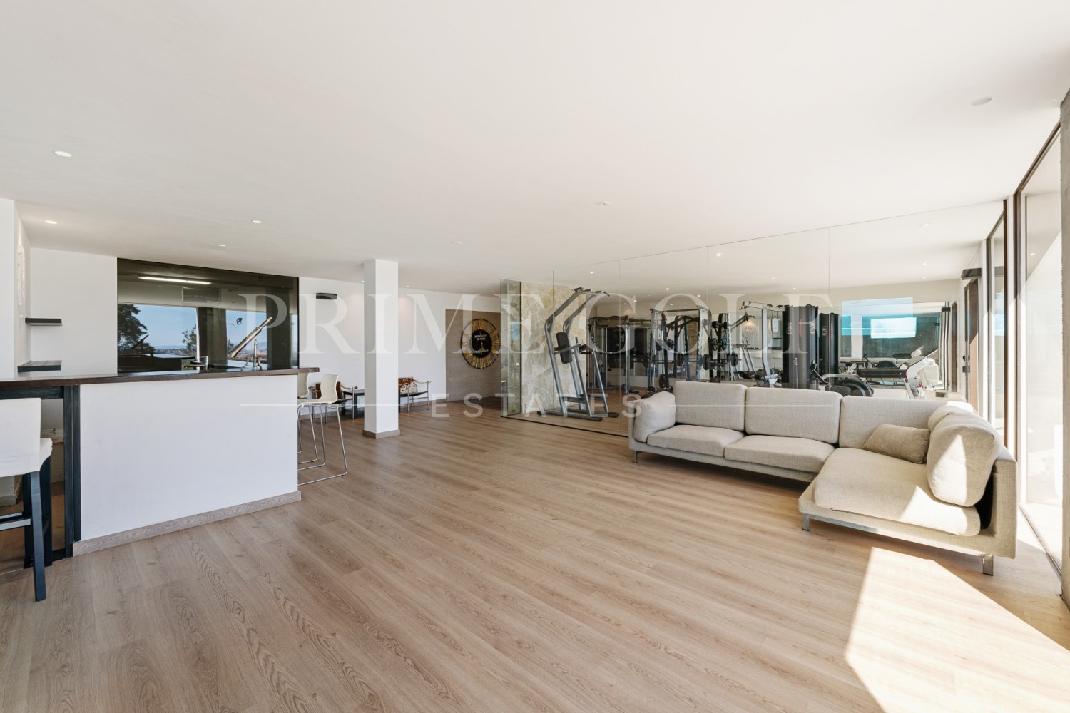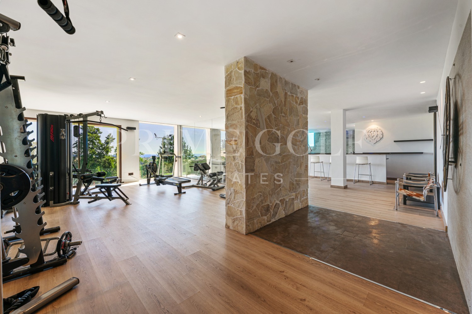 The main level offers spacious living areas, a high ceiling and big windows and doors to enhance the panoramic views. You also find the open plan kitchen with direct access to a terrace with BBQ and panoramic sea views. This level also offers two double bedrooms, one ensuite with panoramic sea views and a full bathroom. On the first floor, you find the main suite with an annexe double bedroom and luxurious bathroom with panoramic views. Another double suite and room that could be used as extra accommodation, gallery, or study room with direct access to the terrace with panoramic views. The ground level features another three ensuite bedrooms, a dedicated service room, a fully equipped gym, a cinema room, and a games room with a bar and bathroom.