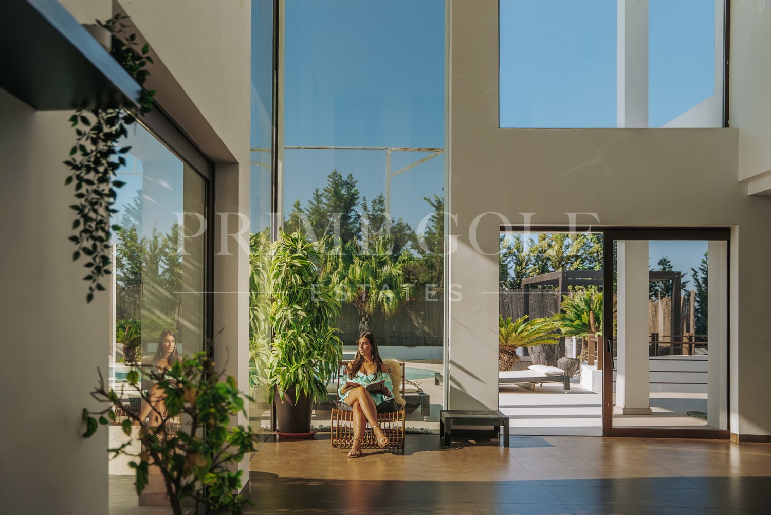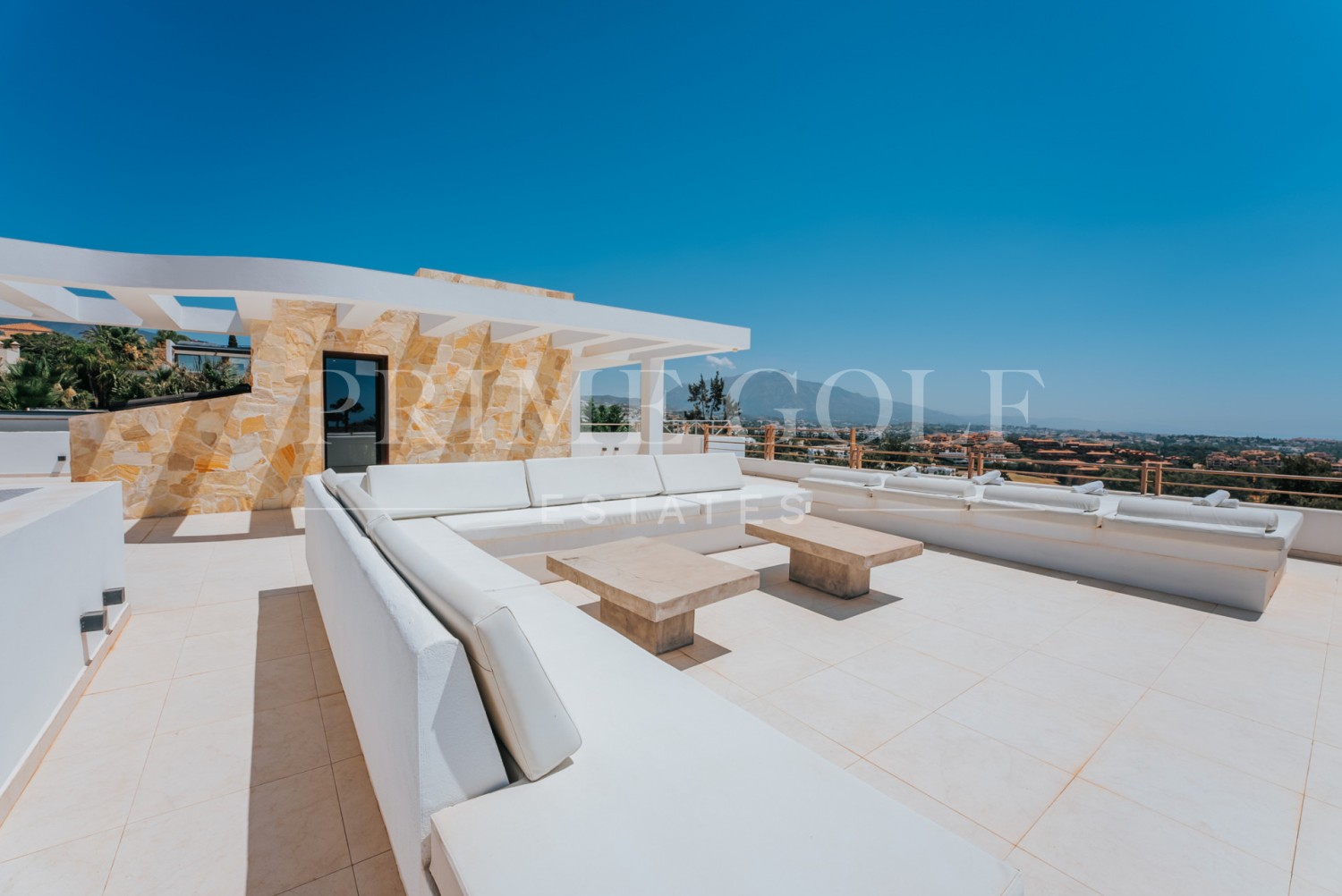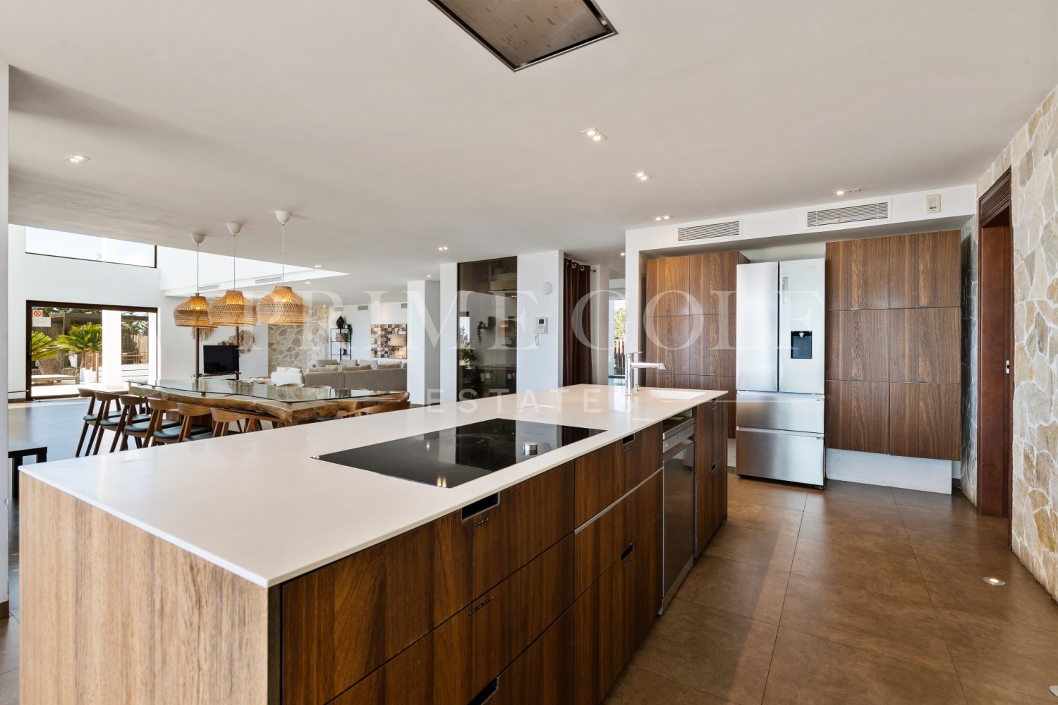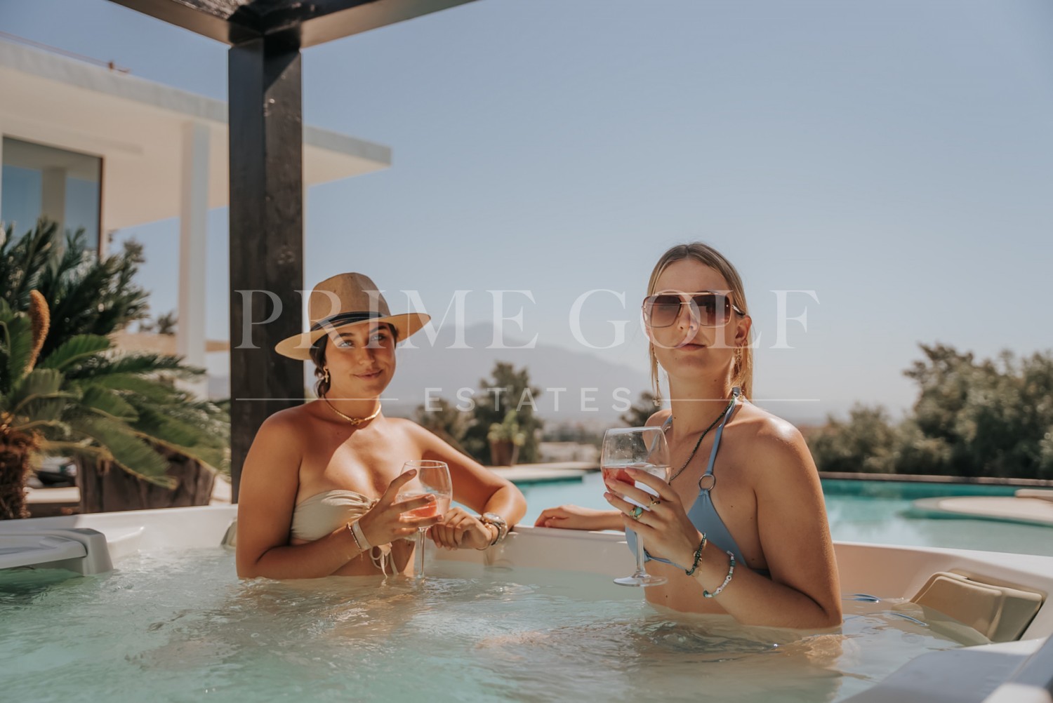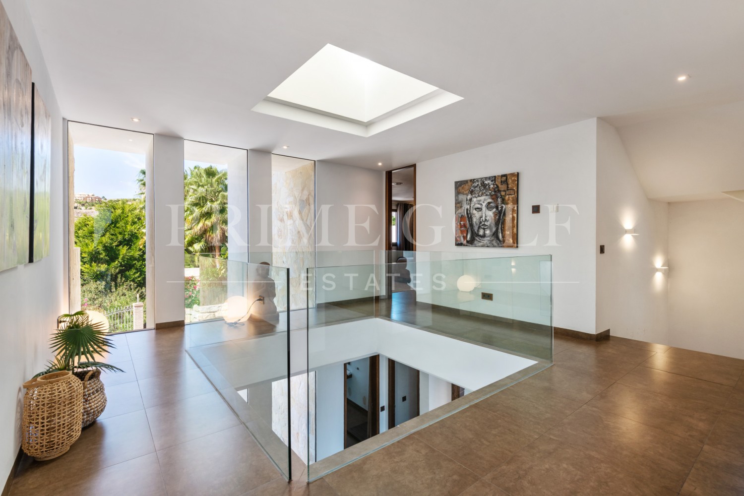 Situated in the La Alquería neighbourhood, Casa Leon is a modern golf-front villa with stunning sea, golf and La Concha mountain views. This light-filled eight-bedroom villa presents a lucrative holiday rental opportunity. Built over four levels, it features open living areas boasting breathtaking views of the Mediterranean Sea, first line to Atalaya Golf and Country Club.