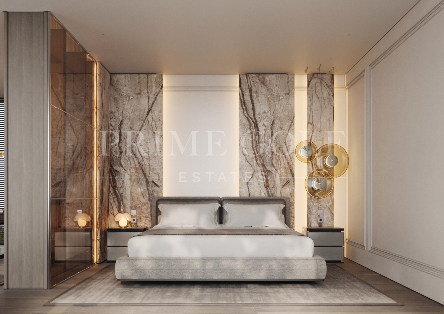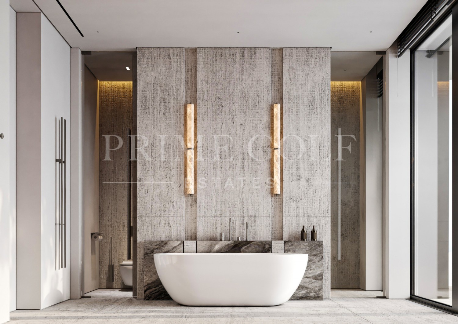 Spanning three thoughtfully designed floors, the grand entrance showcases impressive views through large windows and Soaring Ceilings. The ground floor features elegant living and dining areas, a cozy TV room, and a stunning designer kitchen with a custom island.